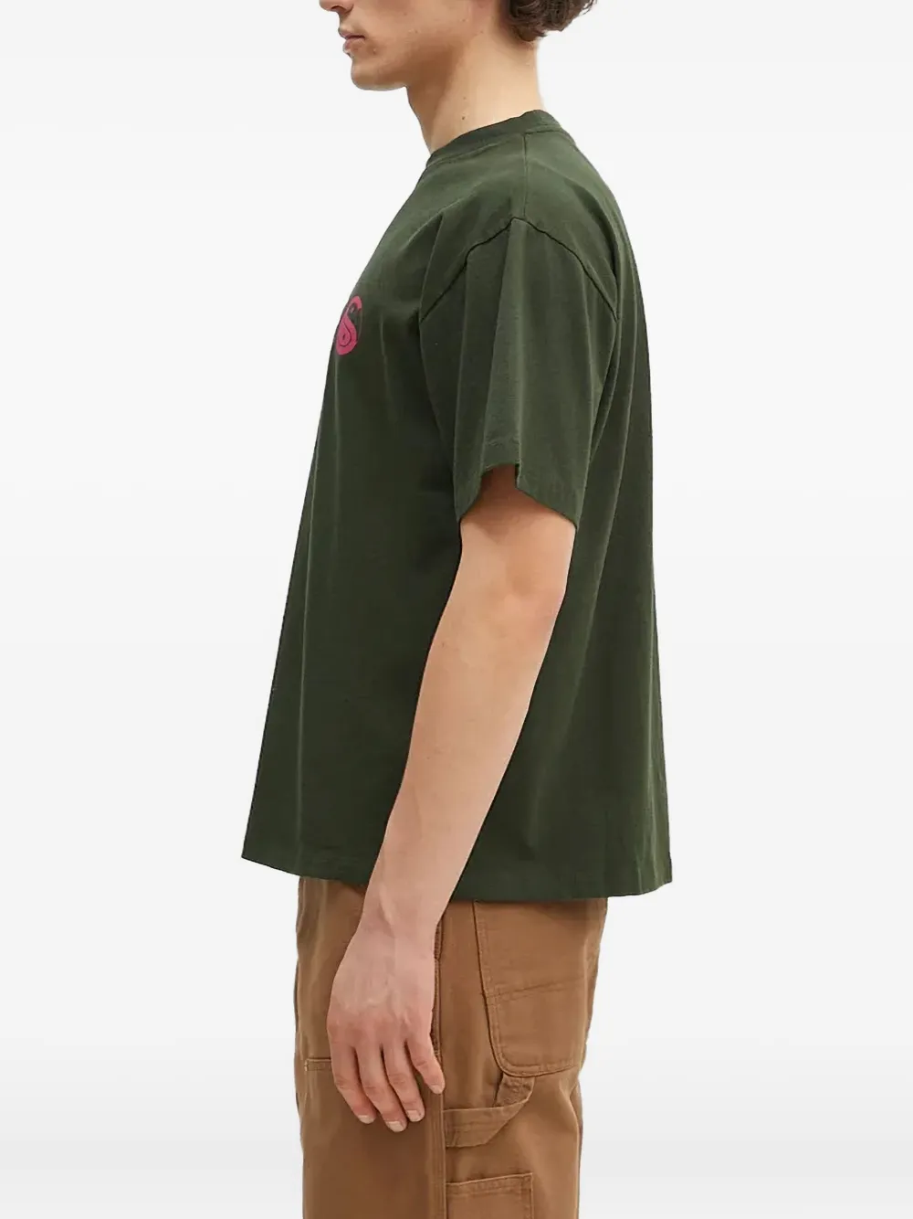 Темно-зеленый с короткими рукавами и круглым вырезом, графический принт с розовым принтом
