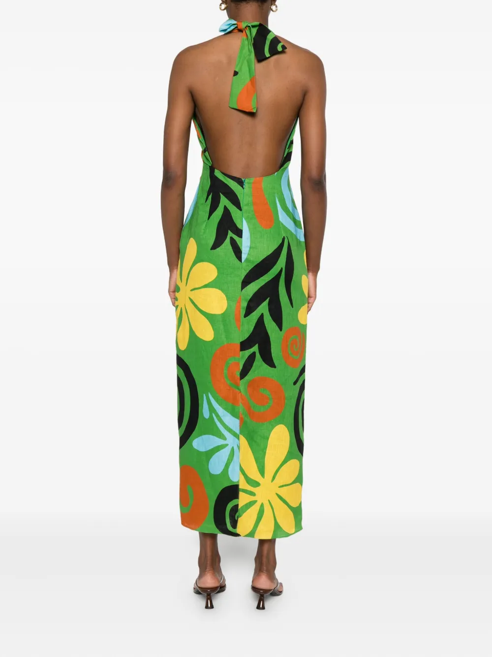 Ярко-зеленая потайная застежка-молния сзади, завязка на шее, V-образный вырез, графический принт по всей поверхности