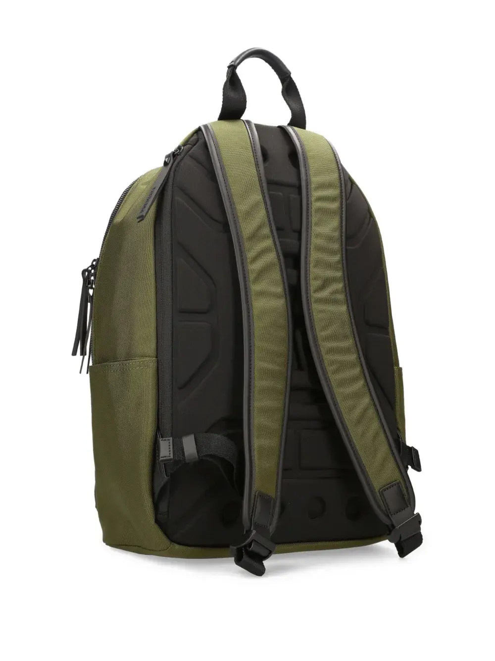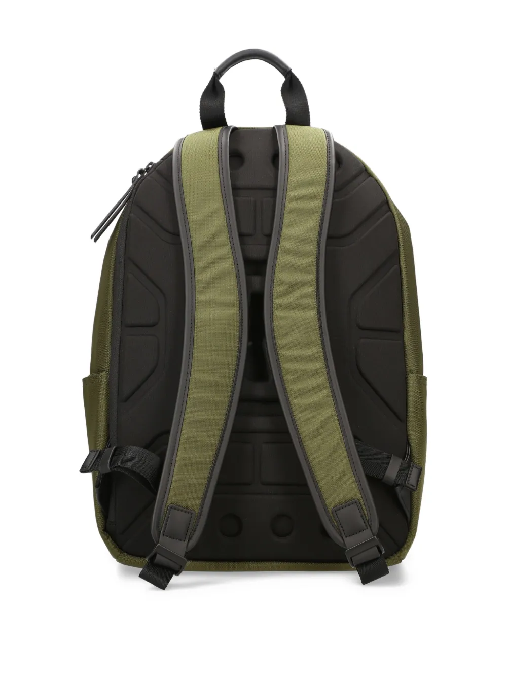 Застежка-молния по всему периметру оливково-зеленого цвета, два регулируемых плечевых ремня с мягкой подкладкой, одна закругленная ручка сверху, карман на молнии спереди