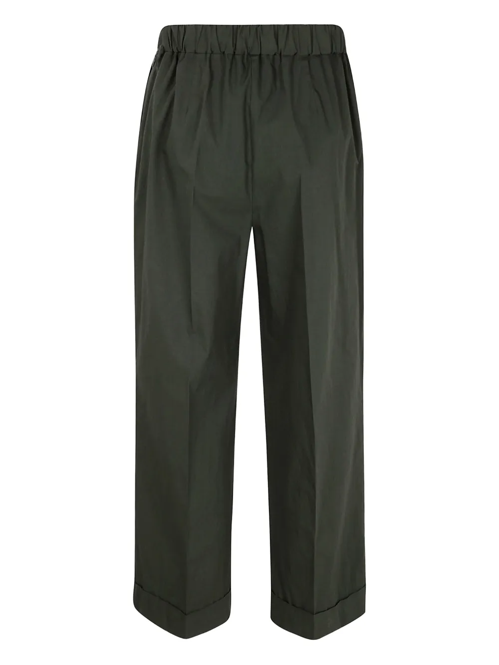 Темно-зеленые складки, эластичный пояс, отвороты, боковые карманы