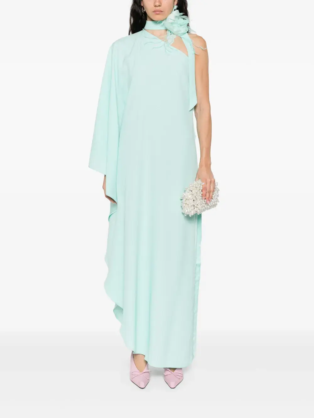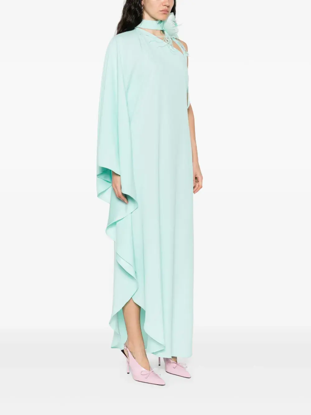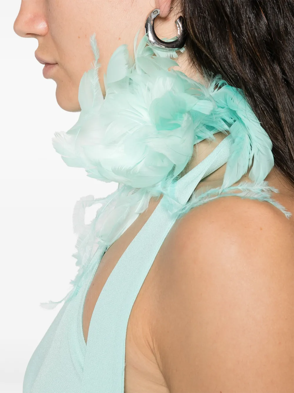Шарф цвета морской волны на одно плечо с боковыми разрезами, декорированный перьями