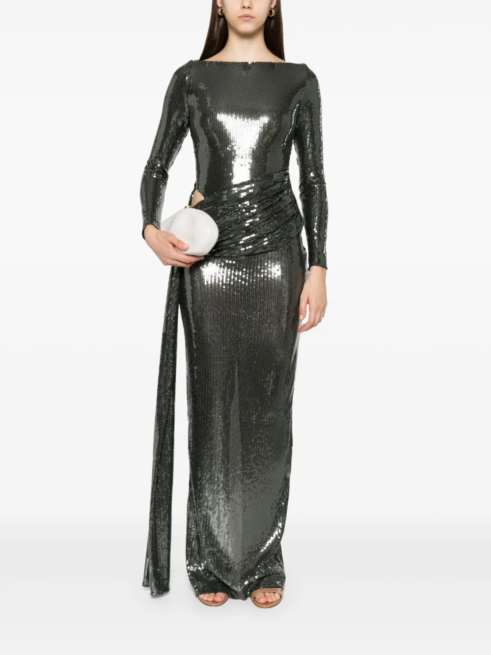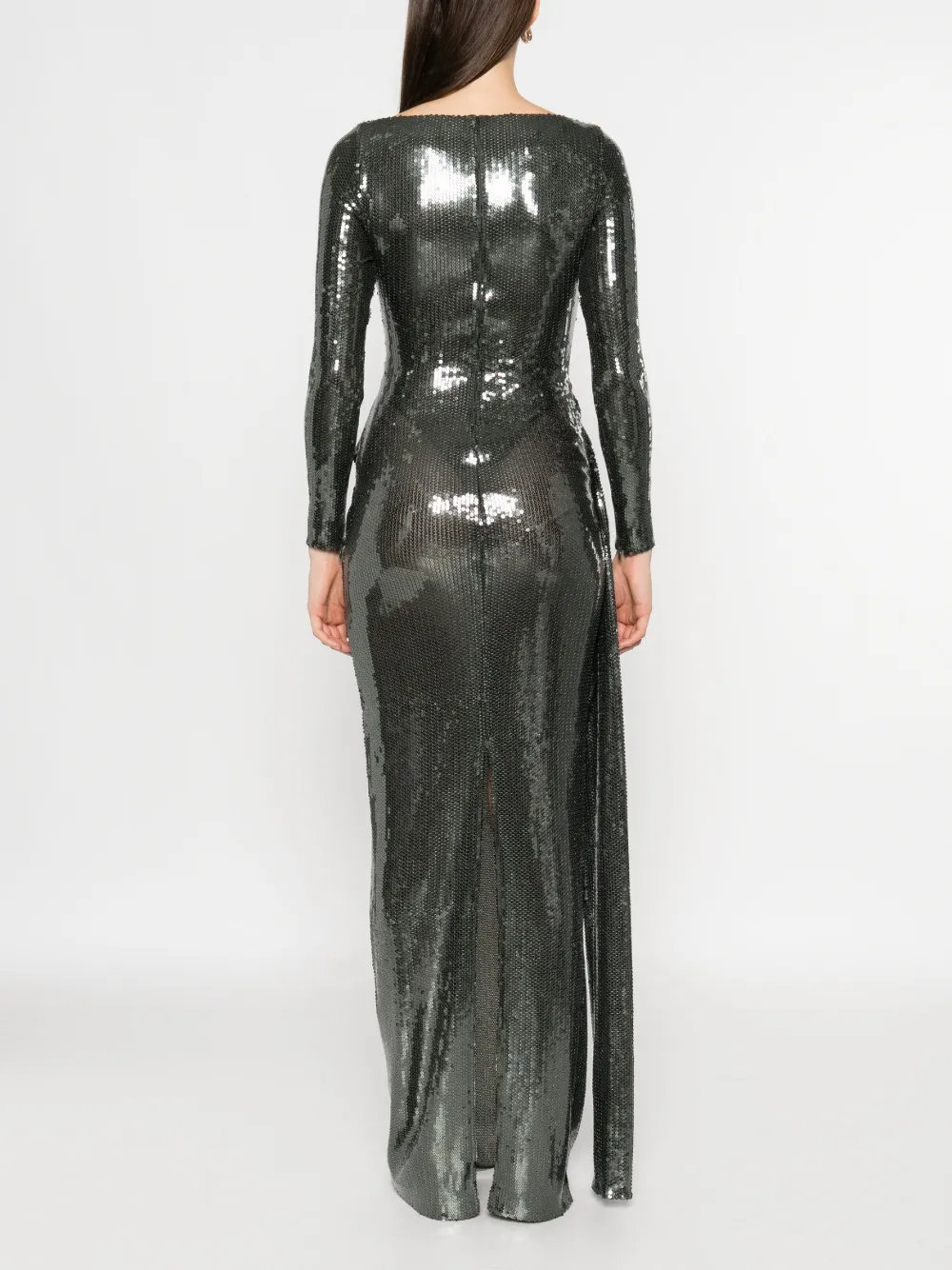 Темно-зеленые пайетки, драпированные детали, длинные рукава, вырез сбоку