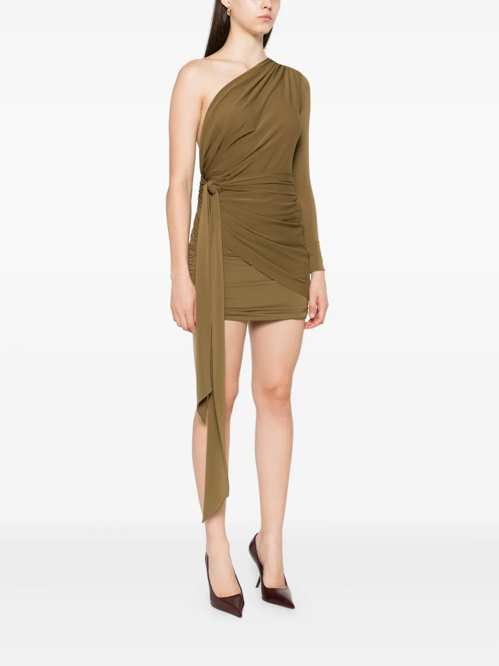 Оливково-зеленый, одно плечо, драпированная ткань, одинарный длинный рукав