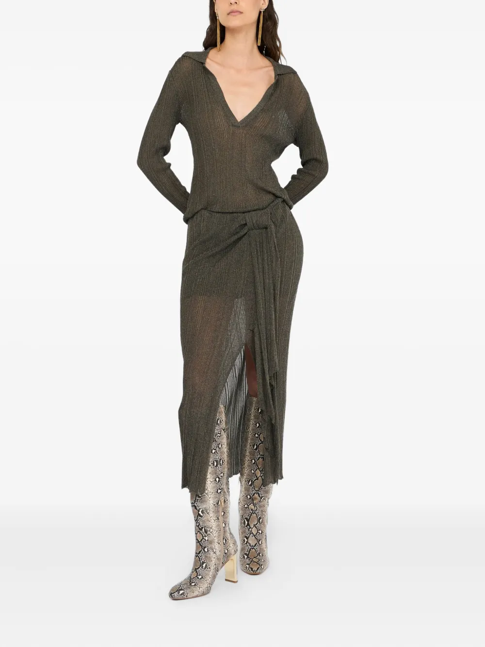 Оливково-зеленый, глубокий V-образный вырез, длинные рукава, фестончатый подол
