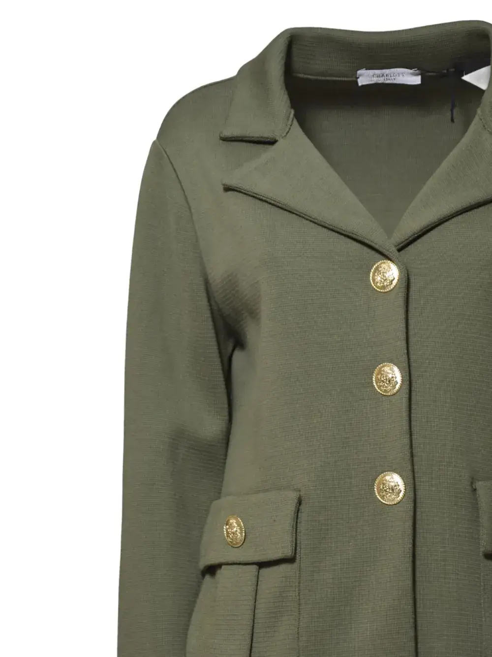Оливково-зеленые, золотистые пуговицы, передние карманы с клапанами, зазубренные лацканы