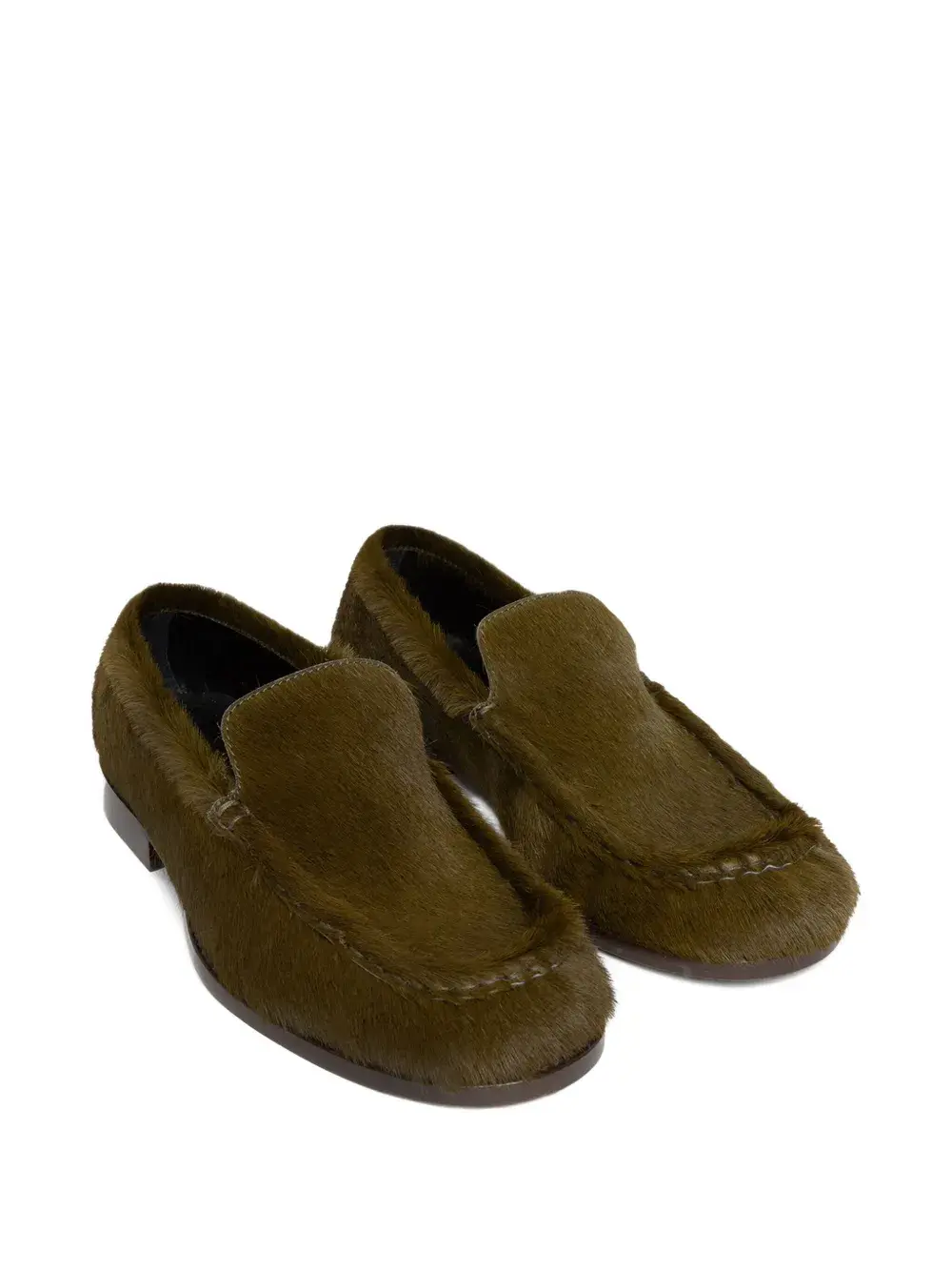 Оливково-зеленые кожаные туфли с закругленным носком и плоской подошвой