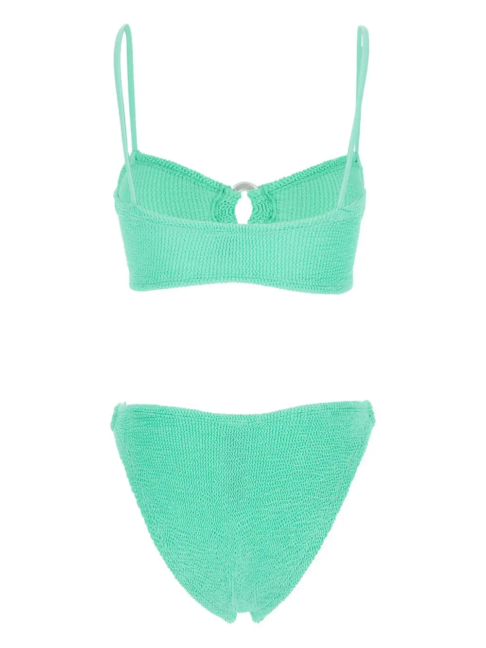 Зеленые тонкие бретельки с кольцевой фурнитурой и высокой талией. Будьте внимательны, примеряя купальники поверх своей одежды.