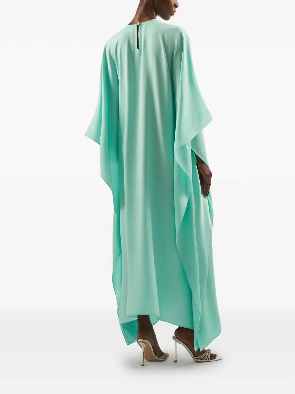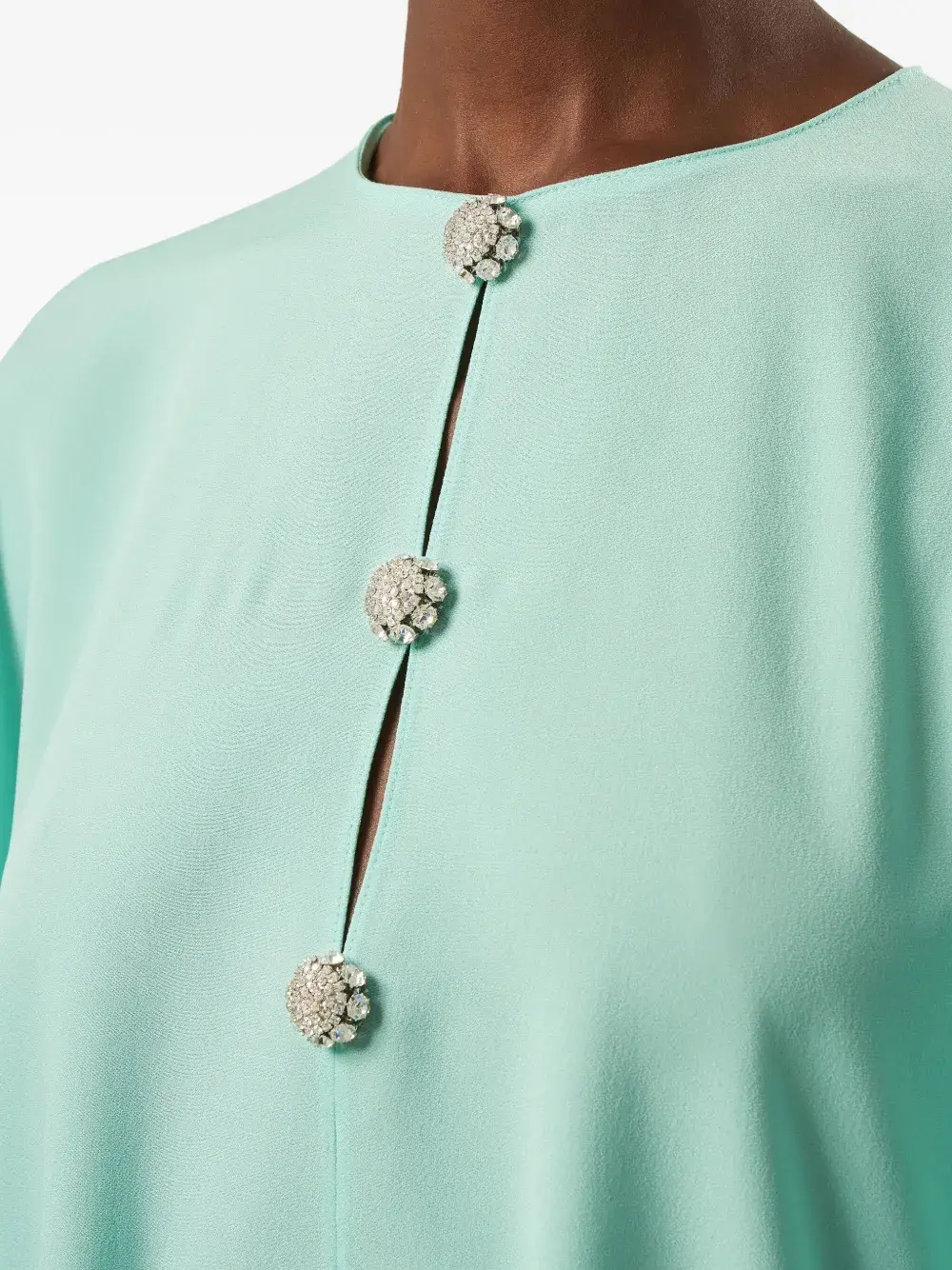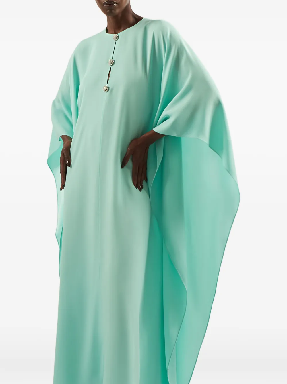 Зеленые рукава «летучая мышь», декор из драгоценных пуговиц, круглый вырез, асимметричный подол, струящийся силуэт.