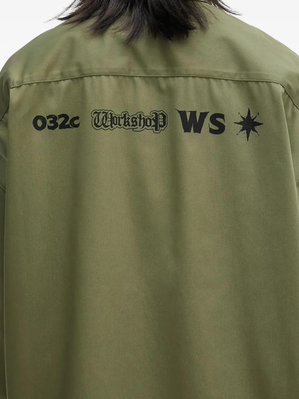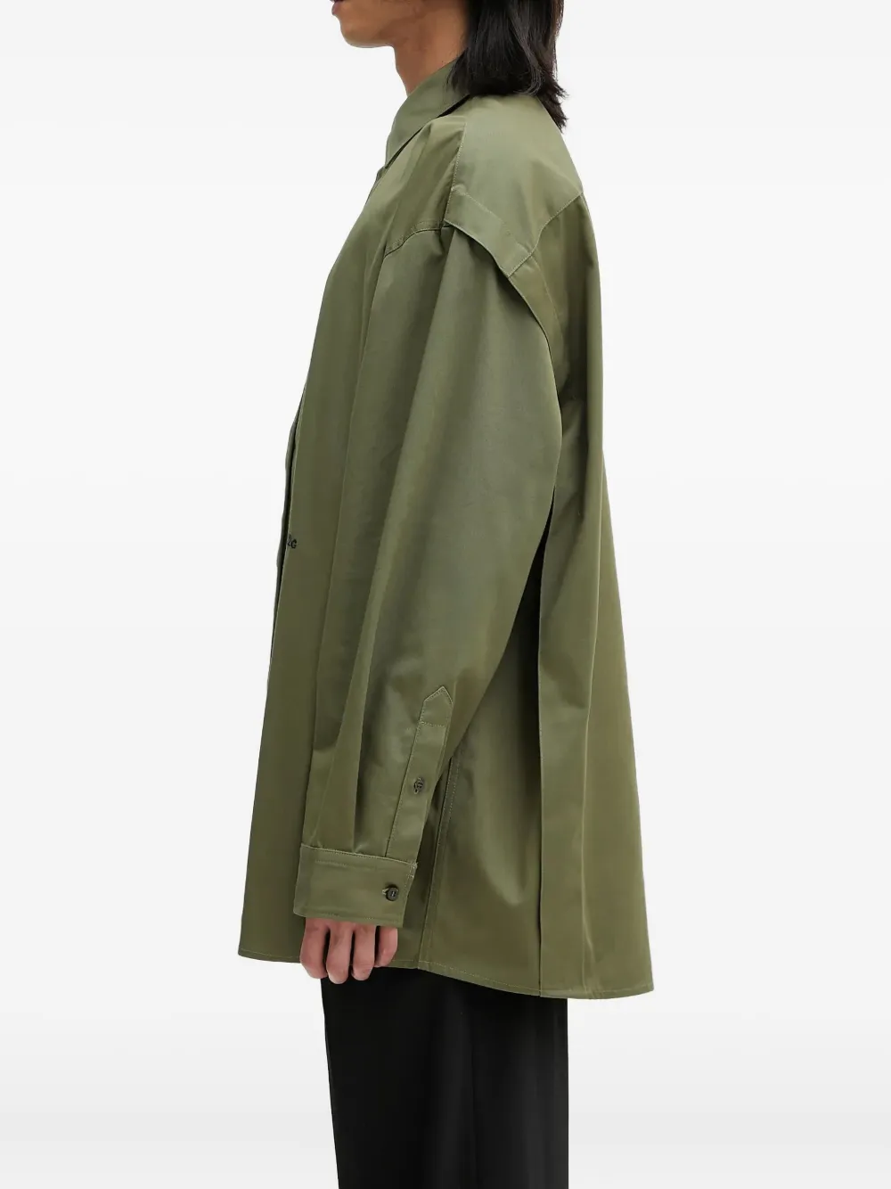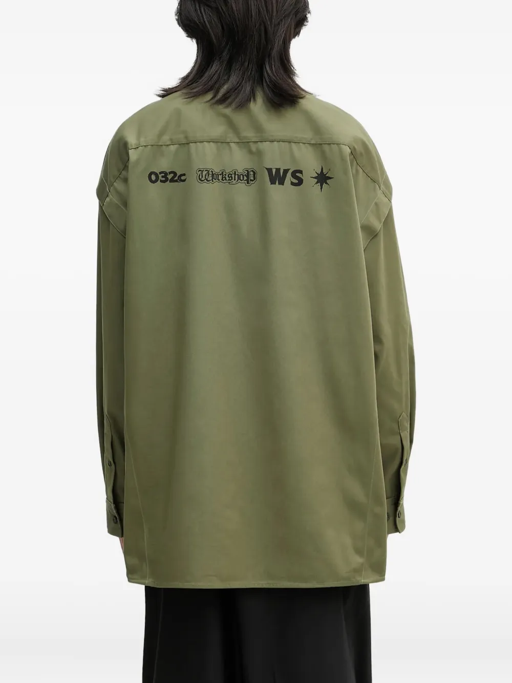 Выцветший зеленый цвет, длинные рукава, застежка на пуговицы, классический воротник, логотип сзади, свободный крой