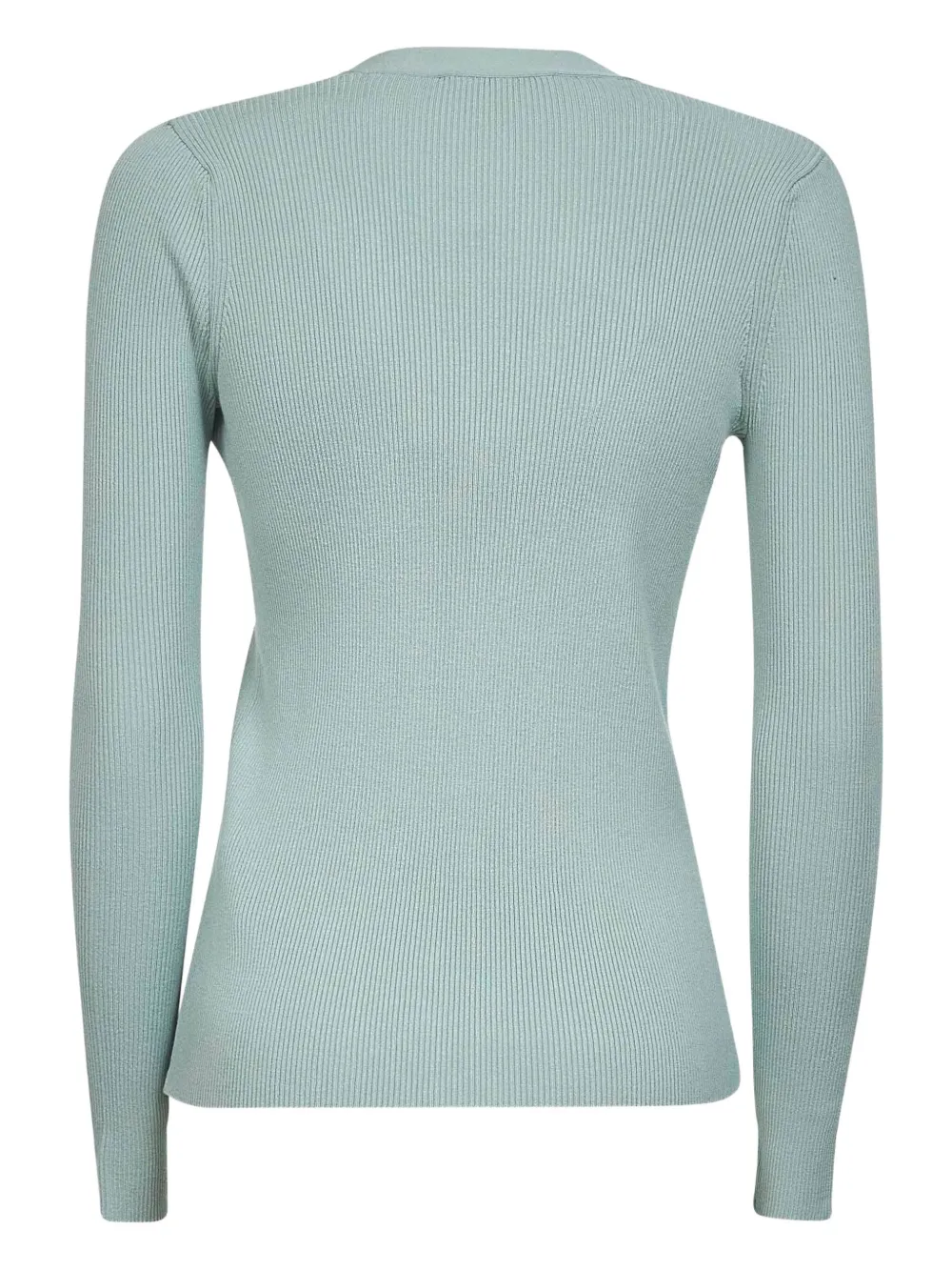 Нефритово-зеленого цвета, трикотаж в рубчик, V-образный вырез, длинные рукава, застежка на пуговицы спереди, эластичный дизайн