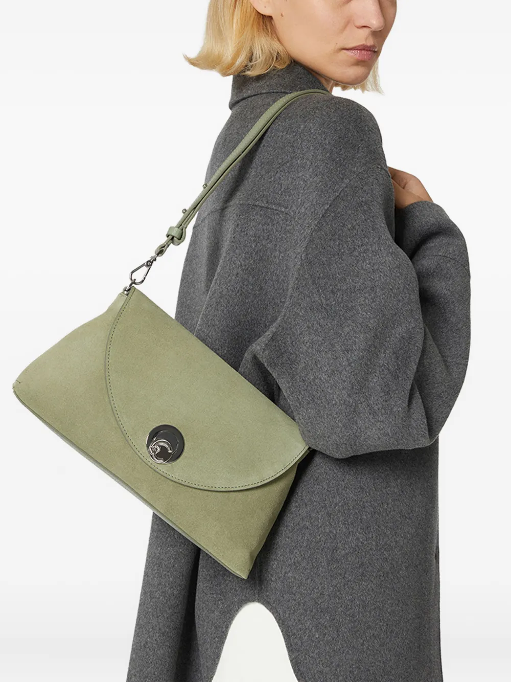 Текстура замши шалфейно-зеленого цвета, круглая застежка, съемный плечевой ремень, изогнутый клапан, верхняя ручка. Подробнее о размерах этого товара смотрите на вкладке «Размер и посадка».