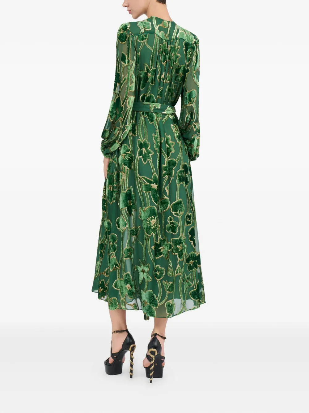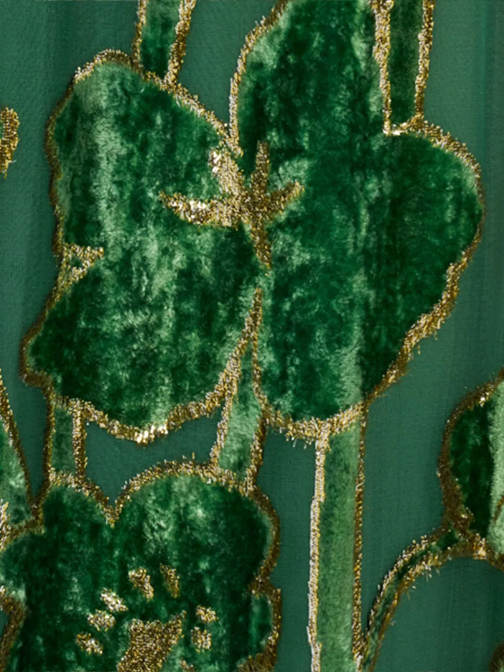 Зеленый бархат, цветочные аппликации, украшения из пайеток, длинные рукава, пояс на талии, застежка на пуговицы