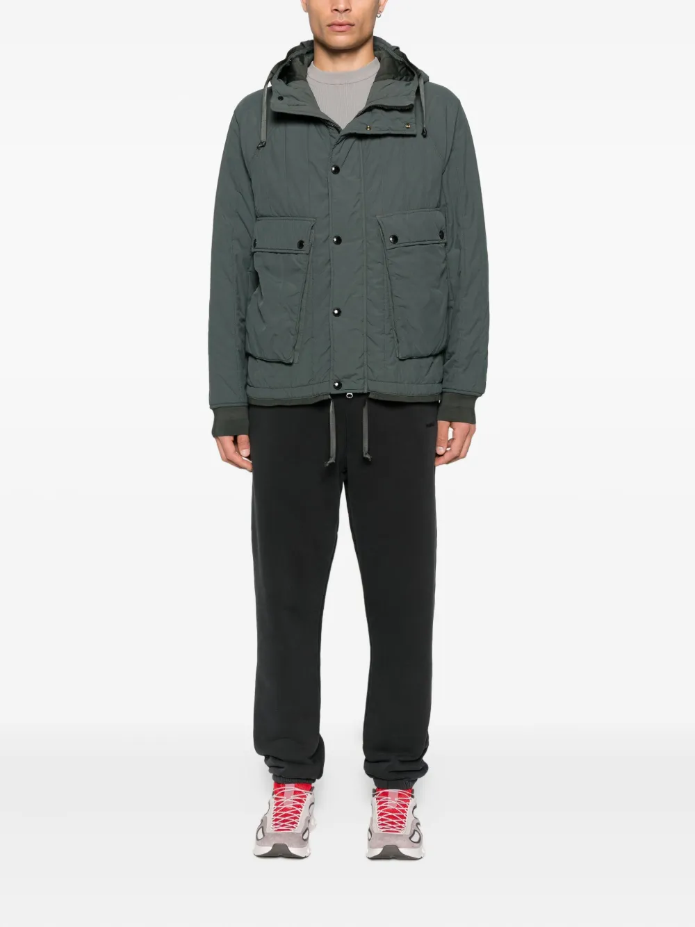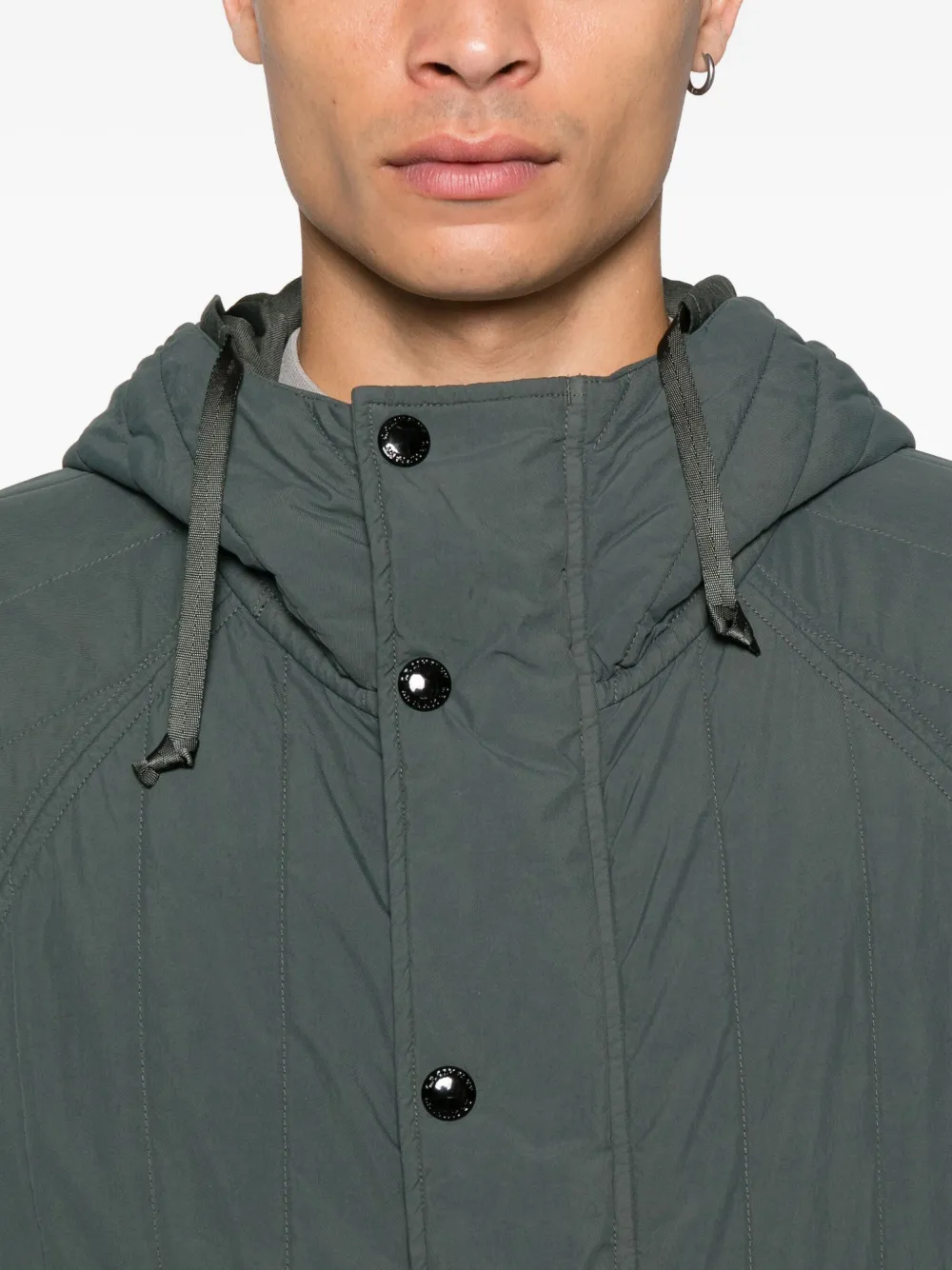Темно-зеленый стеганый дизайн, капюшон, застежка на пуговицы, прорезные карманы, шнурок на подоле