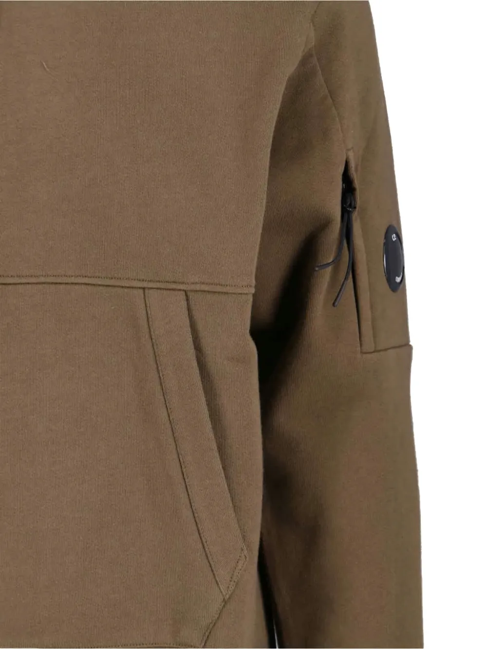 Карман-кенгуру оливкового цвета, деталь для линз, затягивающийся шнурок на капюшоне, ребристые манжеты, ребристый подол. Компания CP Company рекомендует снимать все съемные аксессуары перед стиркой.
