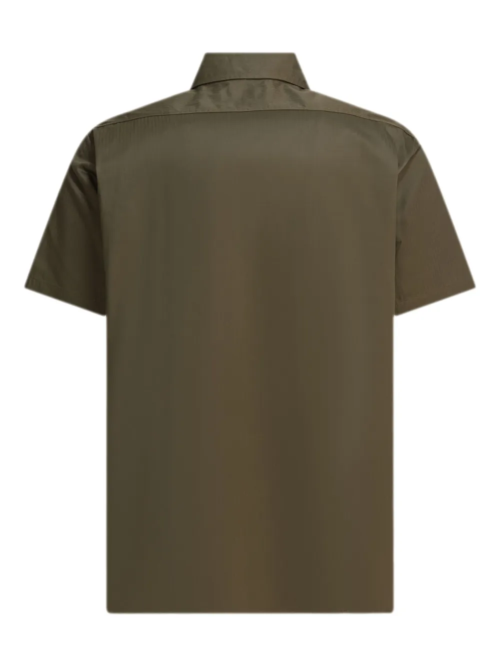 Оливково-зеленый, с узором «в елочку», короткие рукава, застежка на пуговицы, два нагрудных кармана, закругленный подол