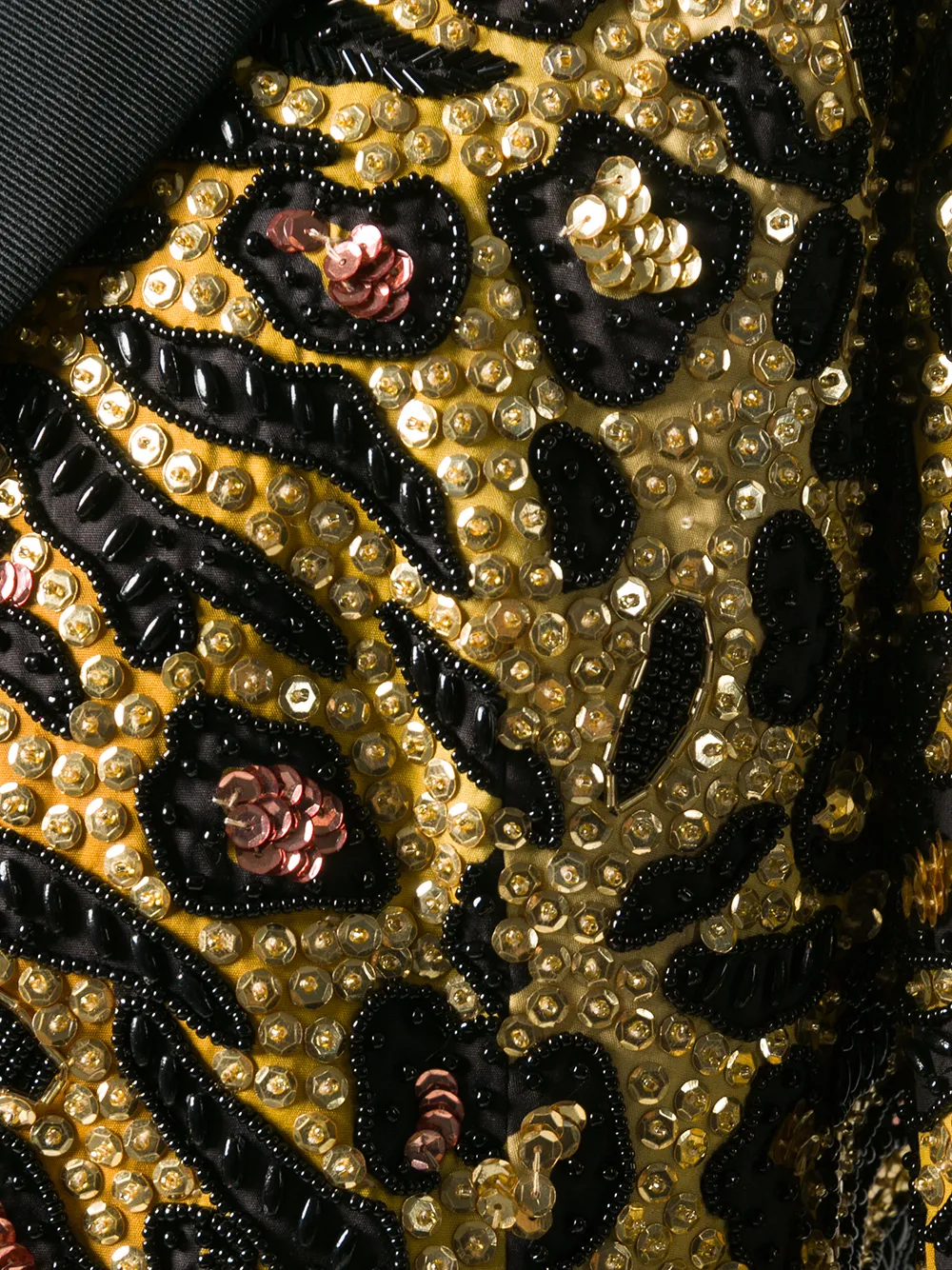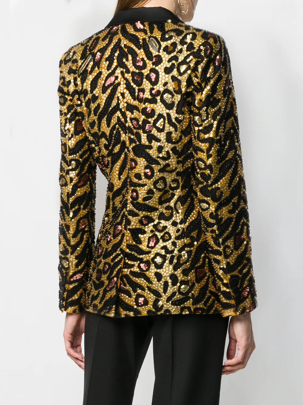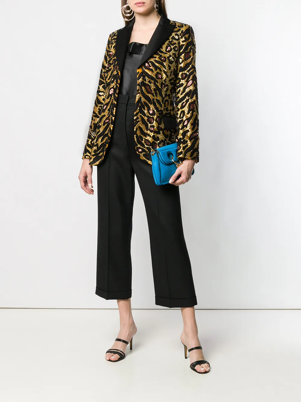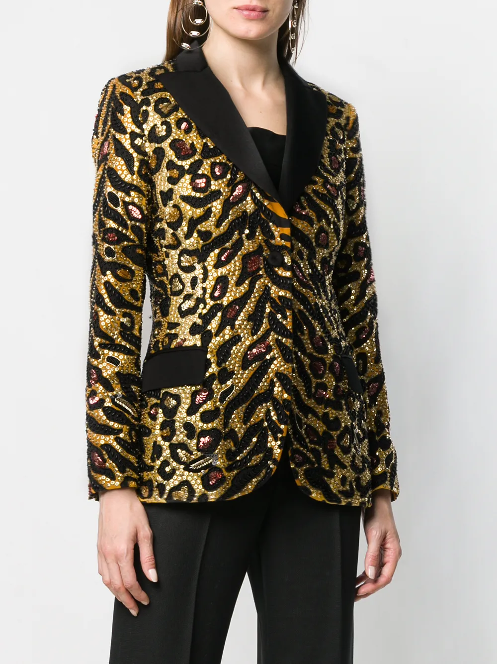 Поплиновый блейзер Tiger от Moschino (Москино). Заостренные лацканы, застежка на пуговицах спереди, карманы с клапанами сбоку, длинные рукава, манжеты на пуговицах, шлица сзади и украшение из пайеток.