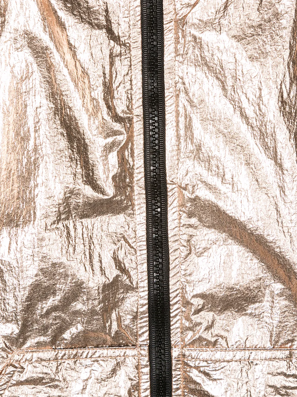 Куртка с капюшоном и эффектом металлик от Andorine. Металлический отблеск, капюшон, застежка на молнии спереди, длинные рукава, свободный крой и два передних кармана.