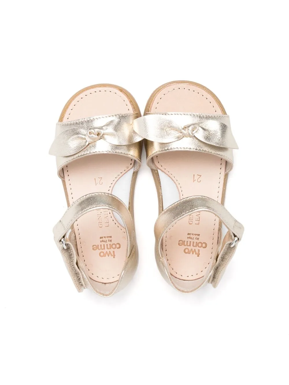 Покрытие с эффектом металлик, бант, кожаная стелька с логотипом, открытый носок, застежка на липучке и плоская резиновая подошва. Цвет: золотистый.