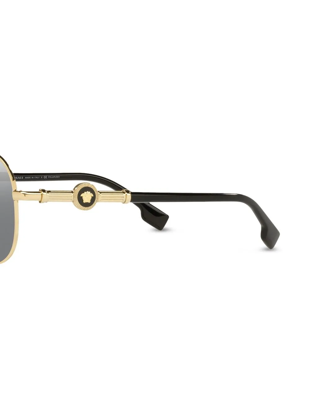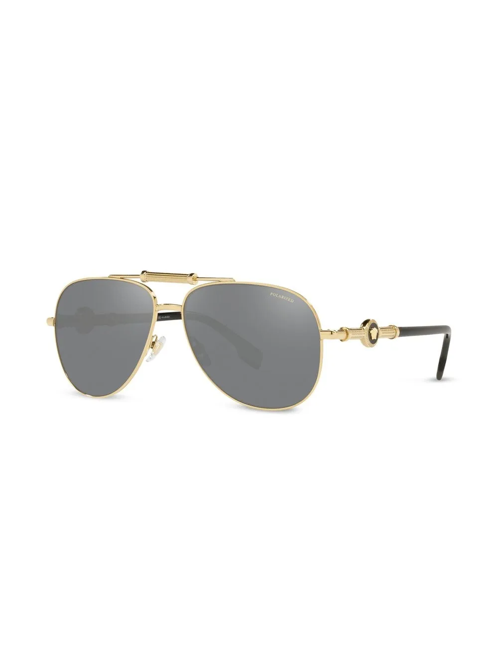 Золотистый, черный, металл, гравировка, серые линзы, линзы с поляризационным фильтром, оправа «пилот», декор Medusa, металлический логотип на дужке, двойной мост и носоупоры. В комплект входит защитный чехол для очков.