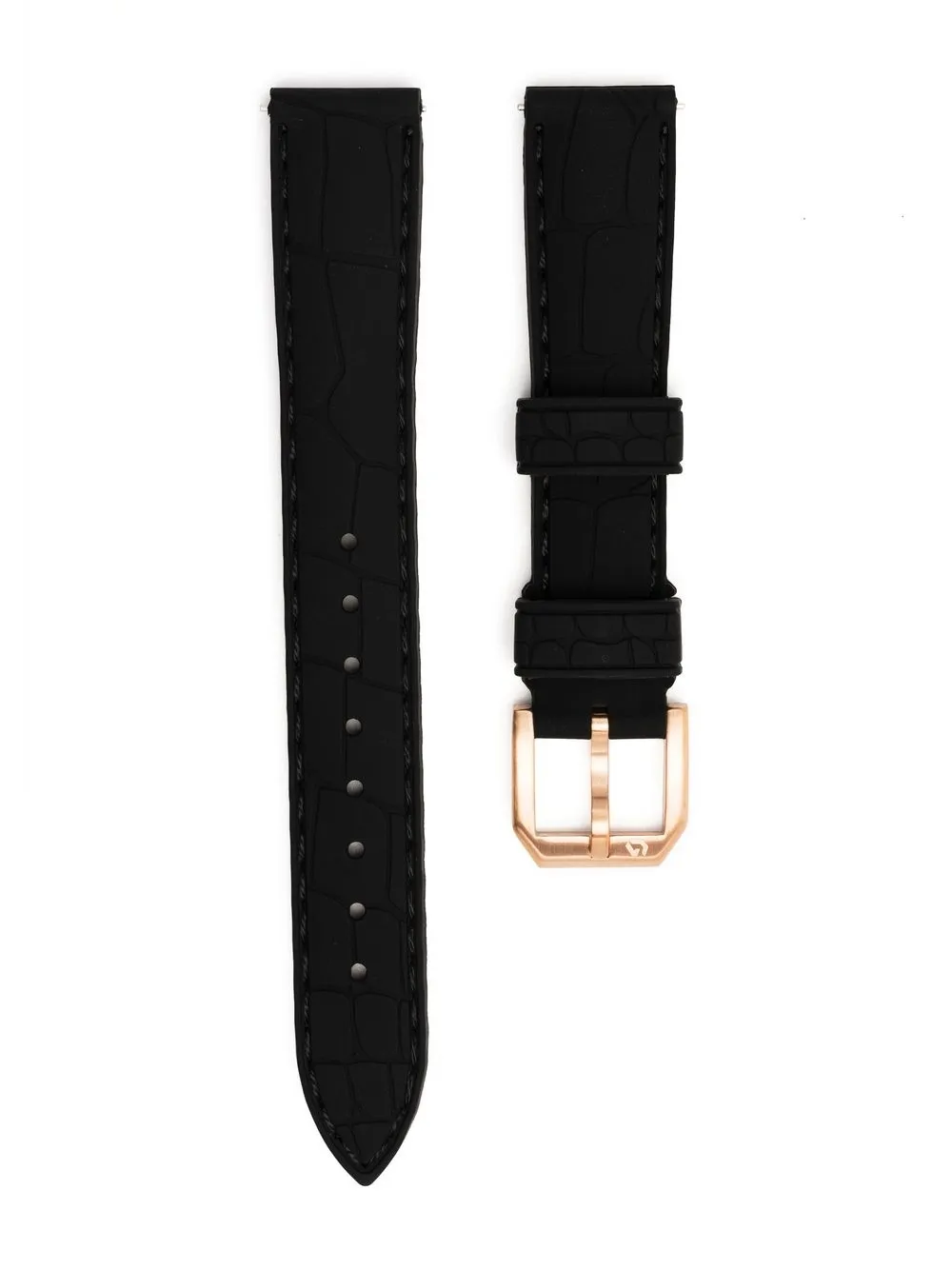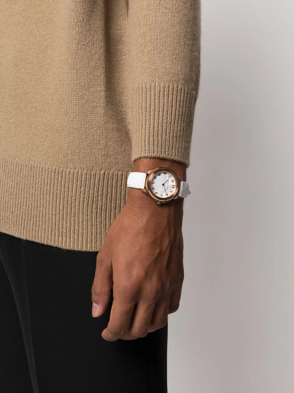 Белый, фурнитура цвета розового золота, нержавеющая сталь, кварцевый механизм, круглый корпус, перламутровый циферблат, прямоугольные вытянутые стрелки, завинчивающаяся заводная коронка, резиновый ремешок и застежка на пряжке.