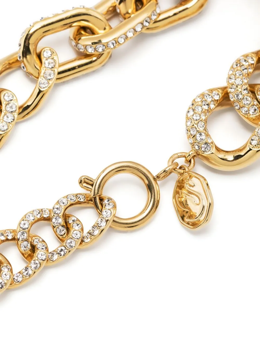 Золотистый, позолота, цепочка, отделка кристаллами Swarovski, закрепка паве, подвеска с логотипом, шпрингельный замок и регулируемый дизайн.