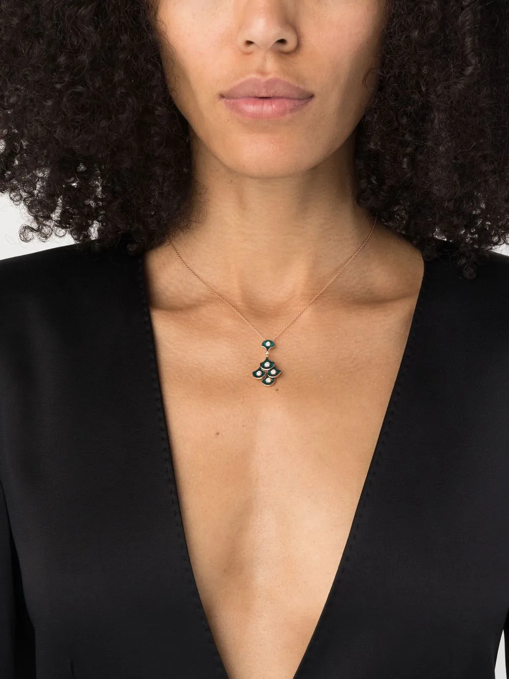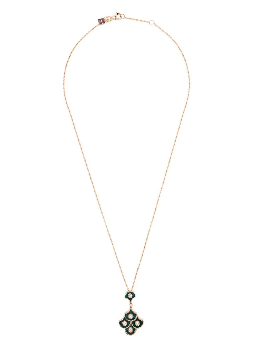 18-каратное розовое золото, белый бриллиант, деталь из эмали, тонкая цепочка и застежка на зажиме.