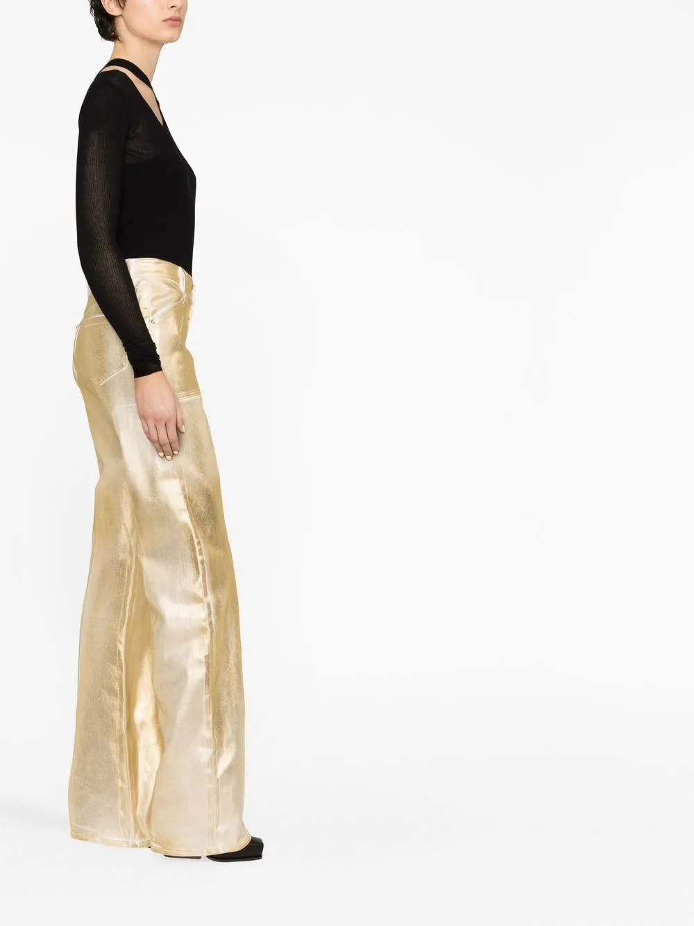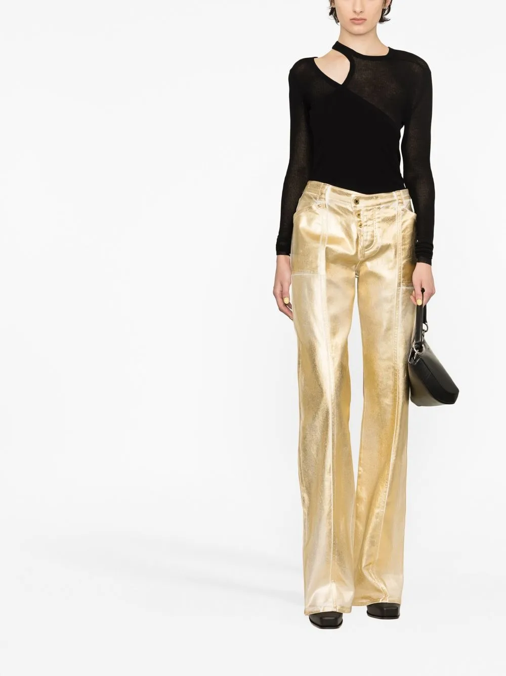 Золотистый, смесовый хлопок, эффект металлик, завышенная талия, петли для ремня, потайная застежка на молнии и пуговицах, прямой крой и широкий крой.