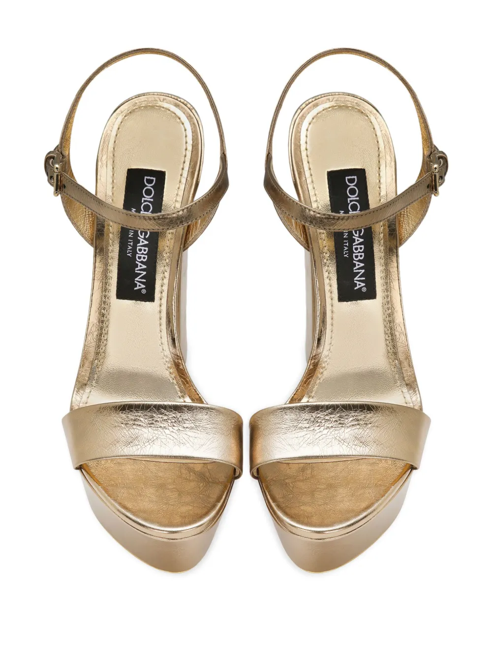 Золотистый, телячья кожа, эффект металлик, ремешок на щиколотке с пряжкой, металлический логотип, кожаная стелька с логотипом, закругленный открытый носок, подошва на платформе и высокий блочный каблук.
