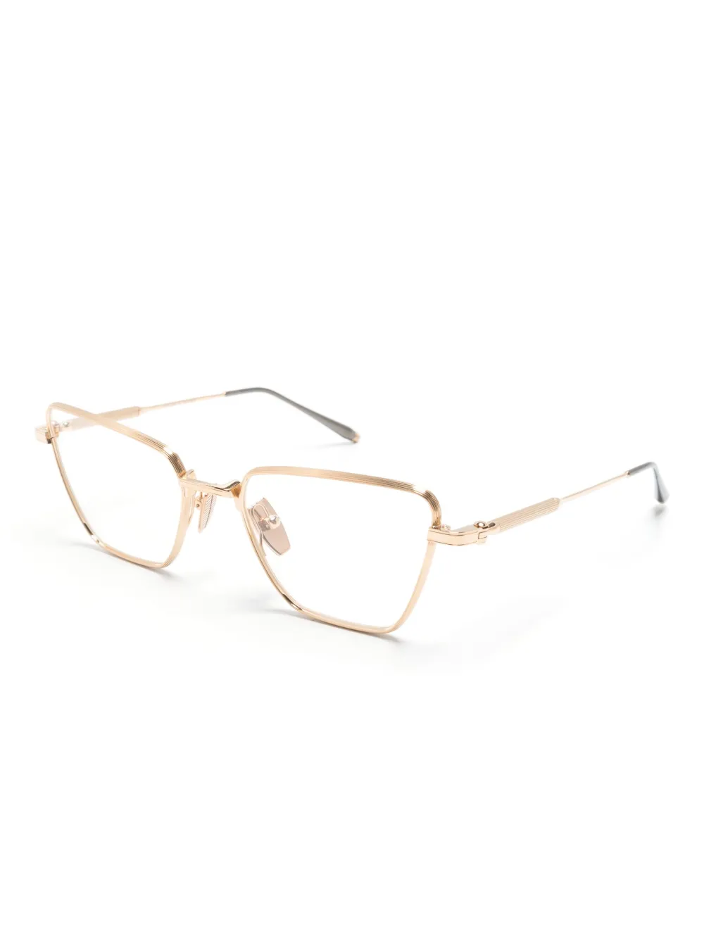 Золотистый, титан, оправа «кошачий глаз», прозрачные линзы, носоупоры, прямые дужки и дужки с закругленными концами. В комплект входит защитный чехол для очков. Обратите внимание, что на FARFETCH продаются оправы с линзами без диоптрий.
