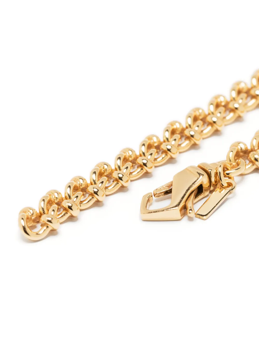 Золотистый, покрытие из 24-каратного золота, серебро 925 пробы, глянцевая фактура, декор в виде узла, кубинская цепочка и застежка-карабин.