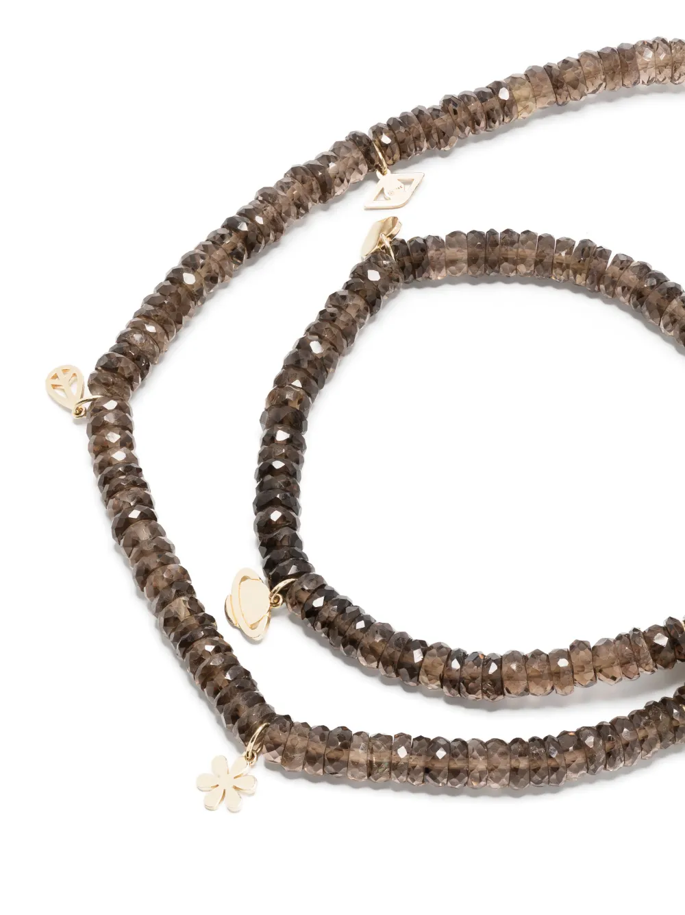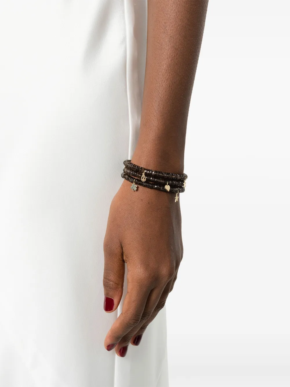 Подробнее о товаре: • 14-каратное желтое золото • глянцевая фактура • браслет в несколько оборотов • черный • топаз • декор из бисера • подвеска • Повседневное использование и воздействие внешних факторов могут уменьшить блеск драгоценных камней и поверхностей, покрытых золотом. Для ухода используйте специальные неабразивные средства, предназначенные для чистки ювелирных изделий.