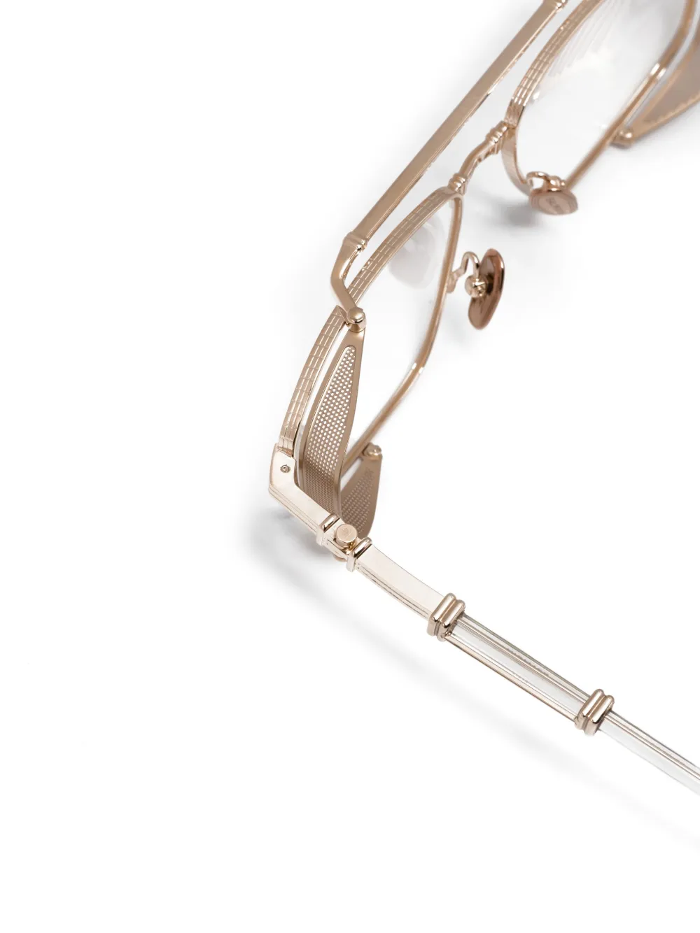 Золотистый, светло-серый, титан, прозрачные линзы, оправа «пилот», двойной мост, носоупоры, перфорация, гравировка, металлический логотип на дужке, скульптурные дужки и дужки с закругленными концами. В комплект входит защитный чехол для очков. Обратите внимание, что на FARFETCH продаются оправы с линзами без диоптрий.