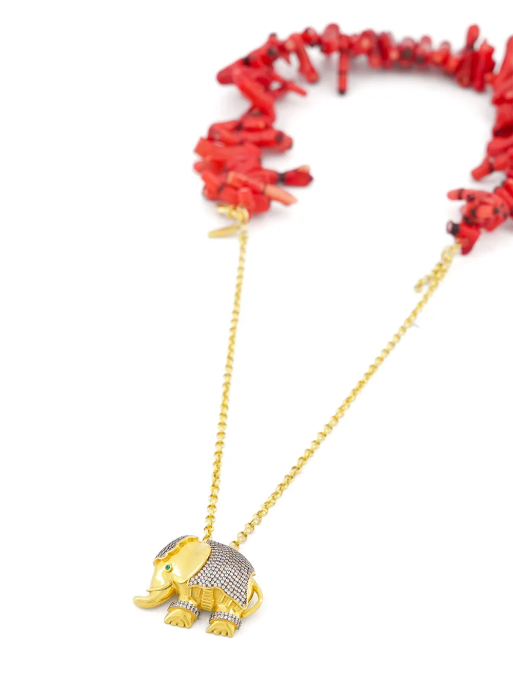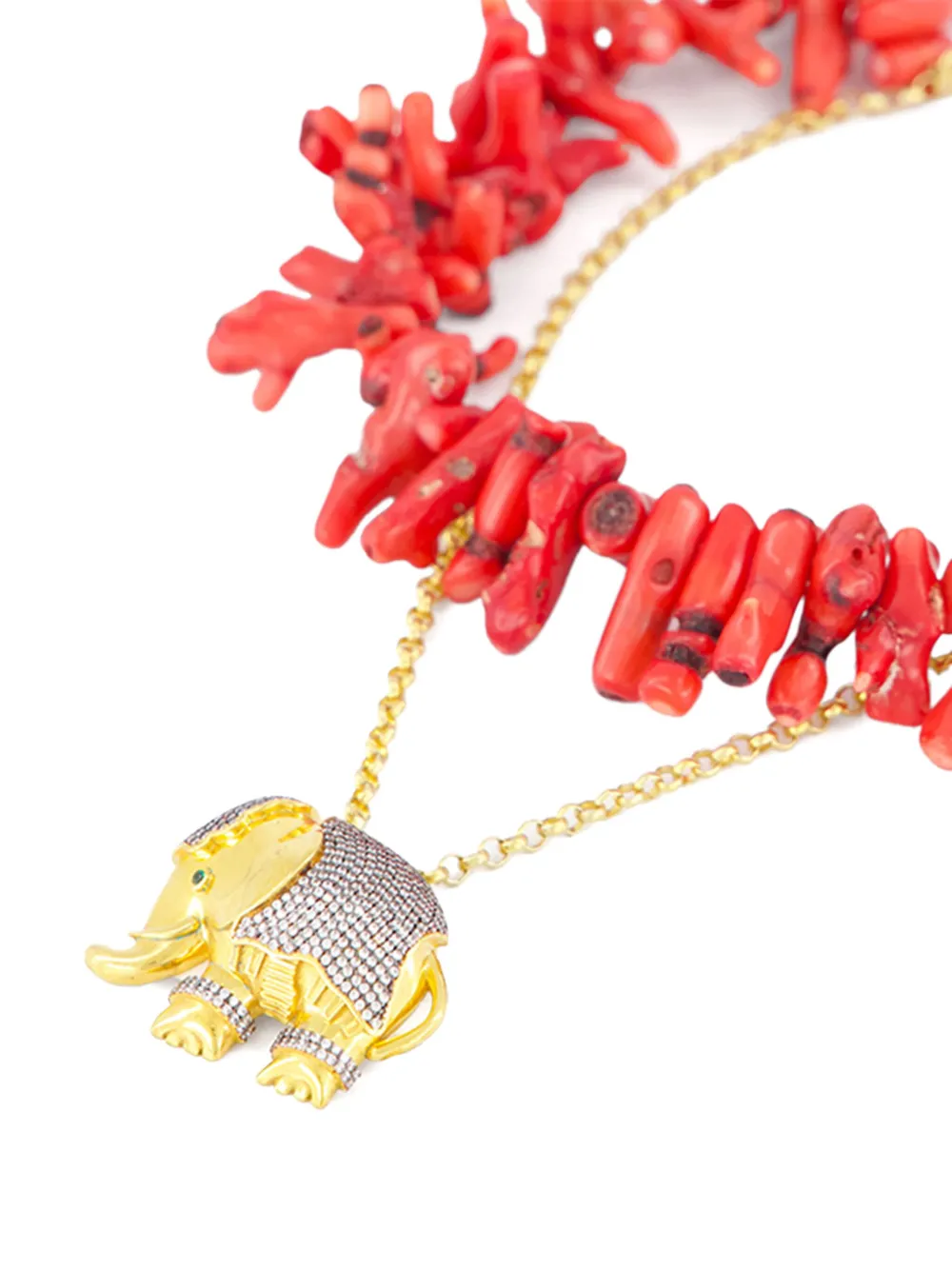 Подробнее о товаре: • покрытие из 24-каратного золота • бронза • застежка на крючок • цепь плетения "бельцер" • декор из искусственных кораллов • кристаллы • подвеска в виде слона • Повседневное использование и воздействие внешних факторов могут уменьшить блеск драгоценных камней и поверхностей, покрытых золотом. Для ухода используйте специальные неабразивные средства, предназначенные для чистки ювелирных изделий.