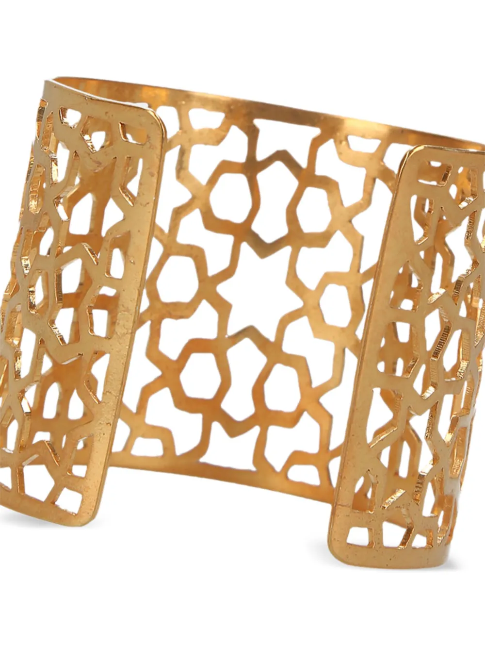Золотая вермель с геометрическим вырезом, отделкой в виде звезд, открытой манжетой и широкой полосой