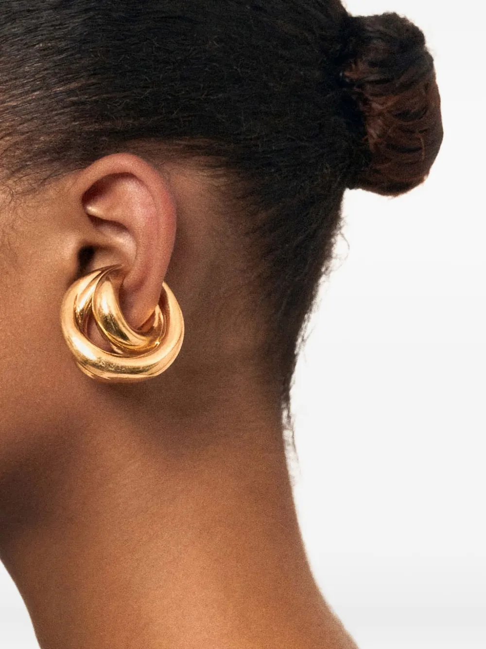 Золотистые переплетенные кольца, полированная отделка, скульптурный дизайн-манжета. Это одиночная серьга.