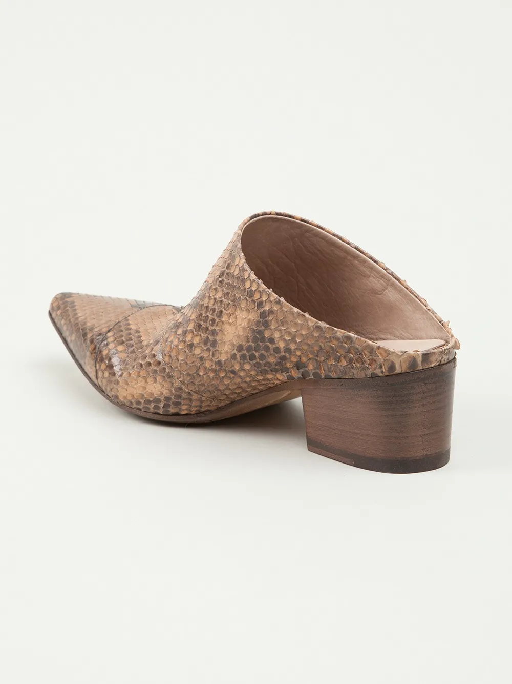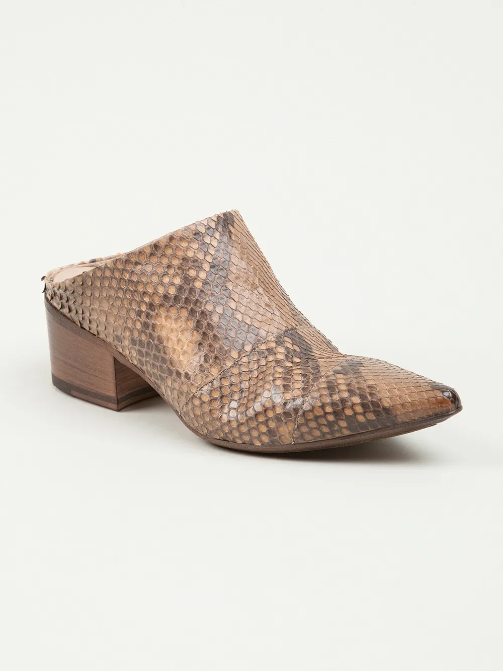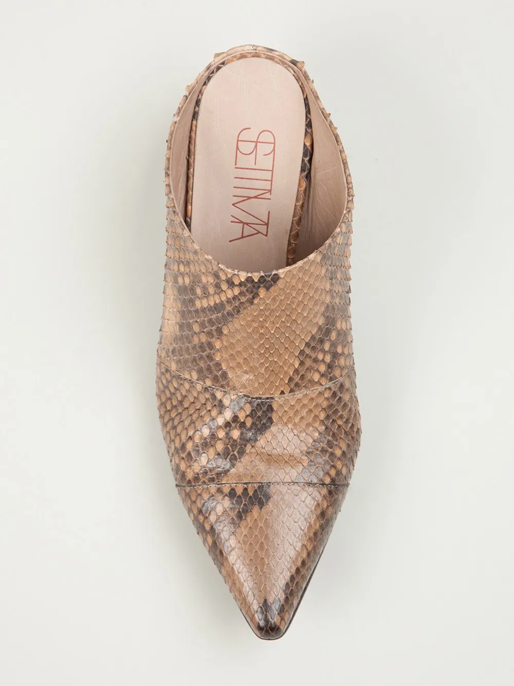 Светло-коричневые кожаные сабо с заостренным носком от Settima. Заостренный носок, стиль без застежки слип-он, стелька с тиснением бренда, низкий каблук-столбик, эффект кожи питона. Размер этой модели достаточно велик, поэтому стоит выбирать на рaзмер меньше.