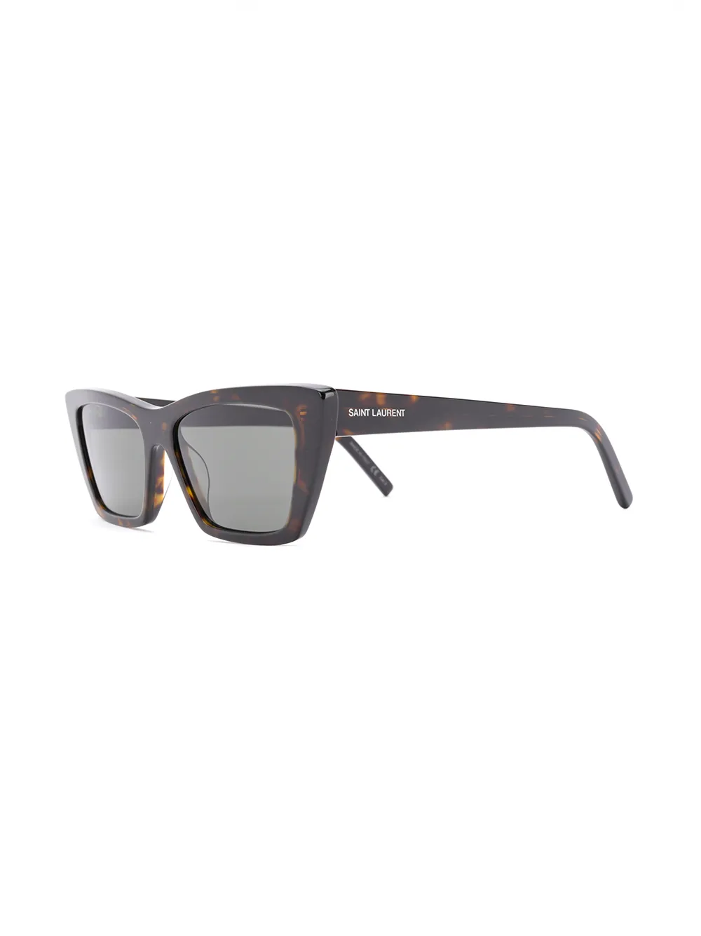 Солнцезащитные очки New Wave от Saint Laurent Eyewear. Оправа 'кошачий глаз', детали из панциря черепахи, темные линзы, логотип на дужке и прямые дужки с изогнутыми концами. Цвет: коричневый. Прилагается защитный чехол. Модель в стиле унисекс.