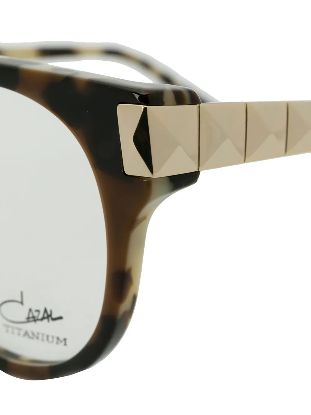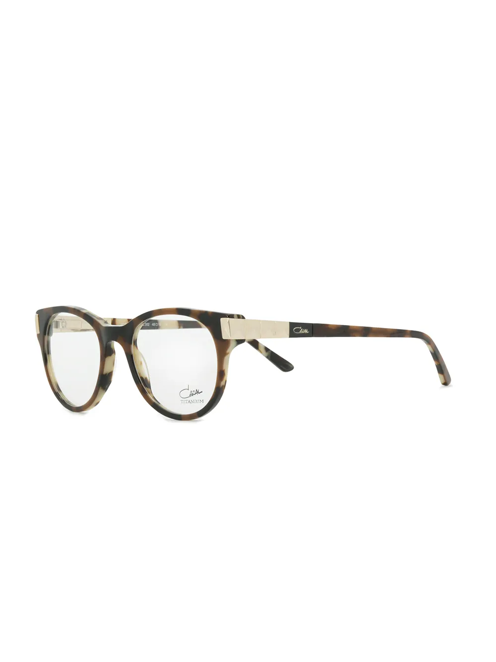 Очки в круглой оправе от Cazal. Эффект черепашьего панциря, логотип на дужке и прямые дужки с изогнутыми концами. Прилагается защитный чехол.