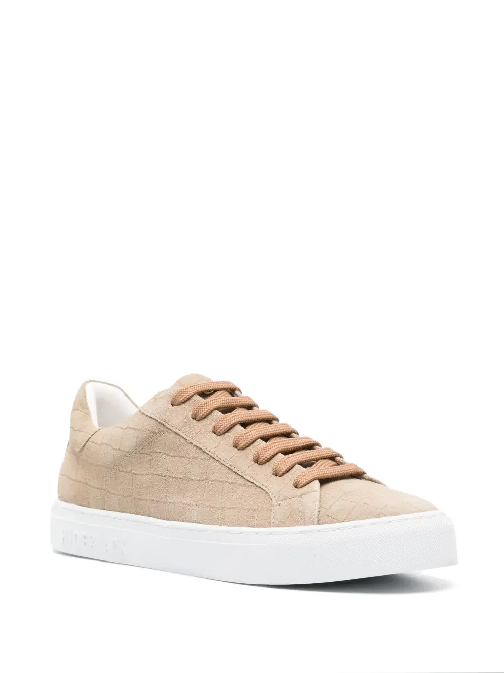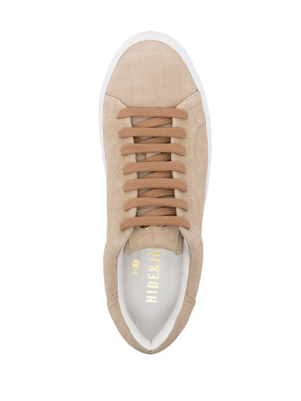 Тиснение под кожу крокодила, нашивка с логотипом на язычке, плоская резиновая подошва и закругленный носок.