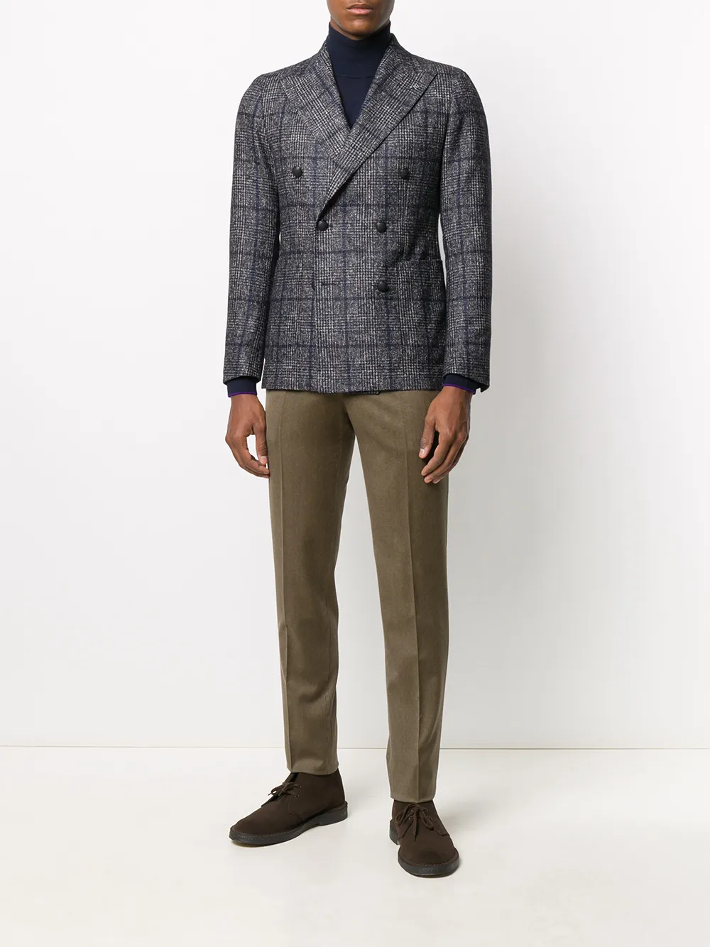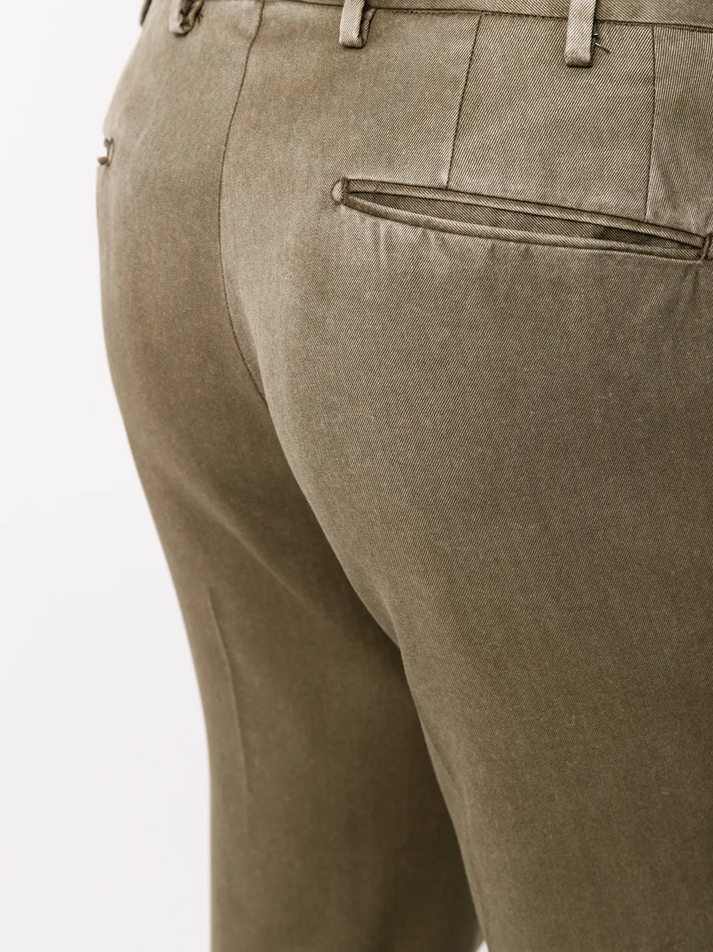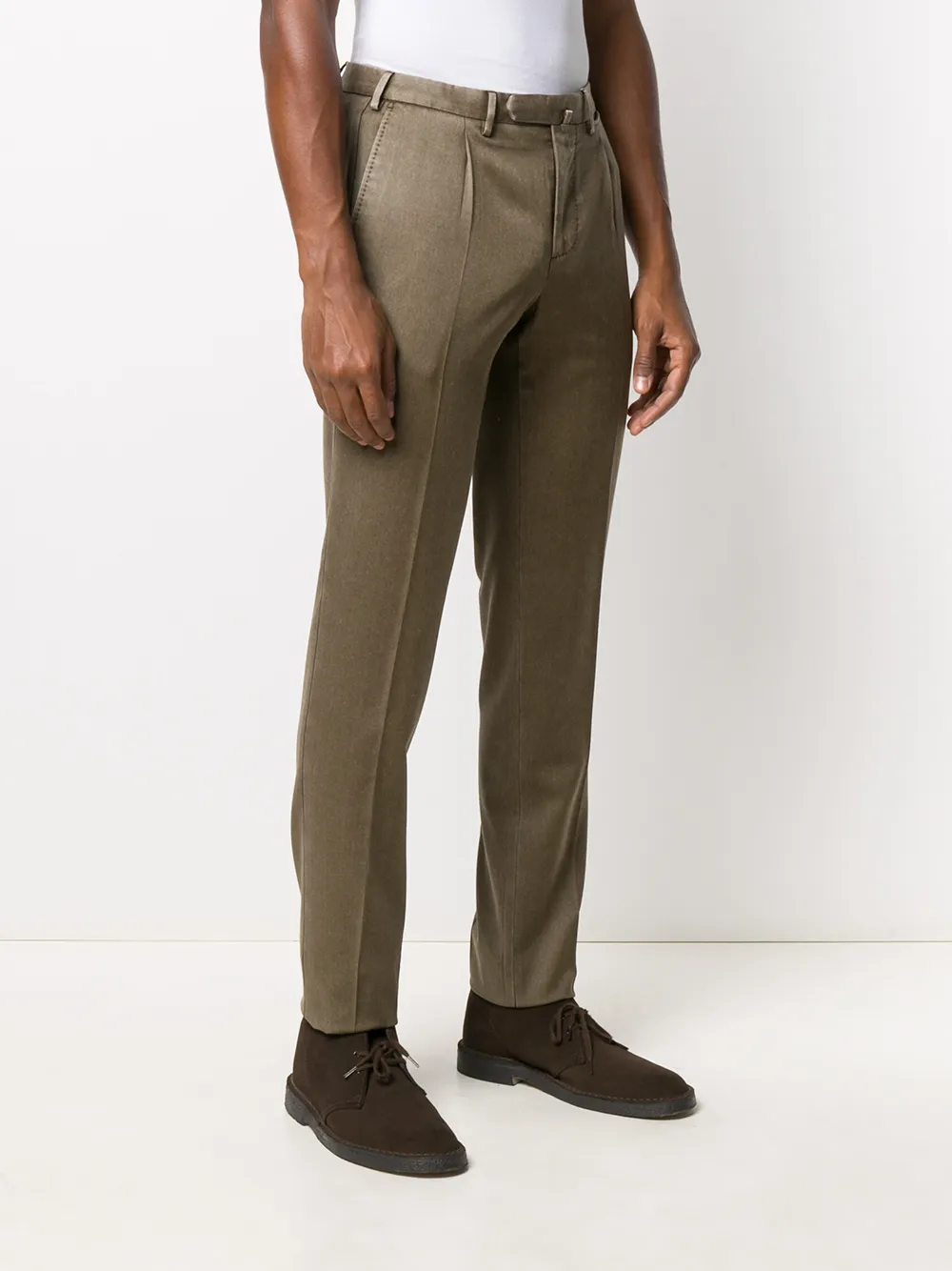 Застежка на крючке спереди, петли для ремня, прорезные карманы по бокам, встречная складка, стрелки и два кармана с листочкой сзади. Цвет: коричневый.