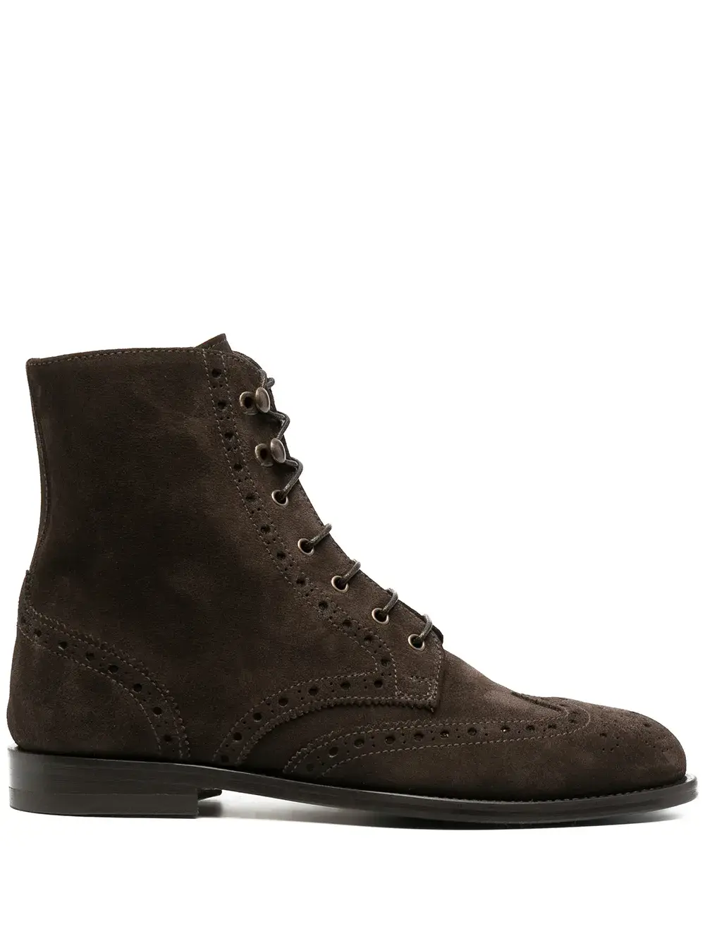 Шнуровка спереди, закругленный носок, брогирование и плоская резиновая подошва. Цвет: коричневый.