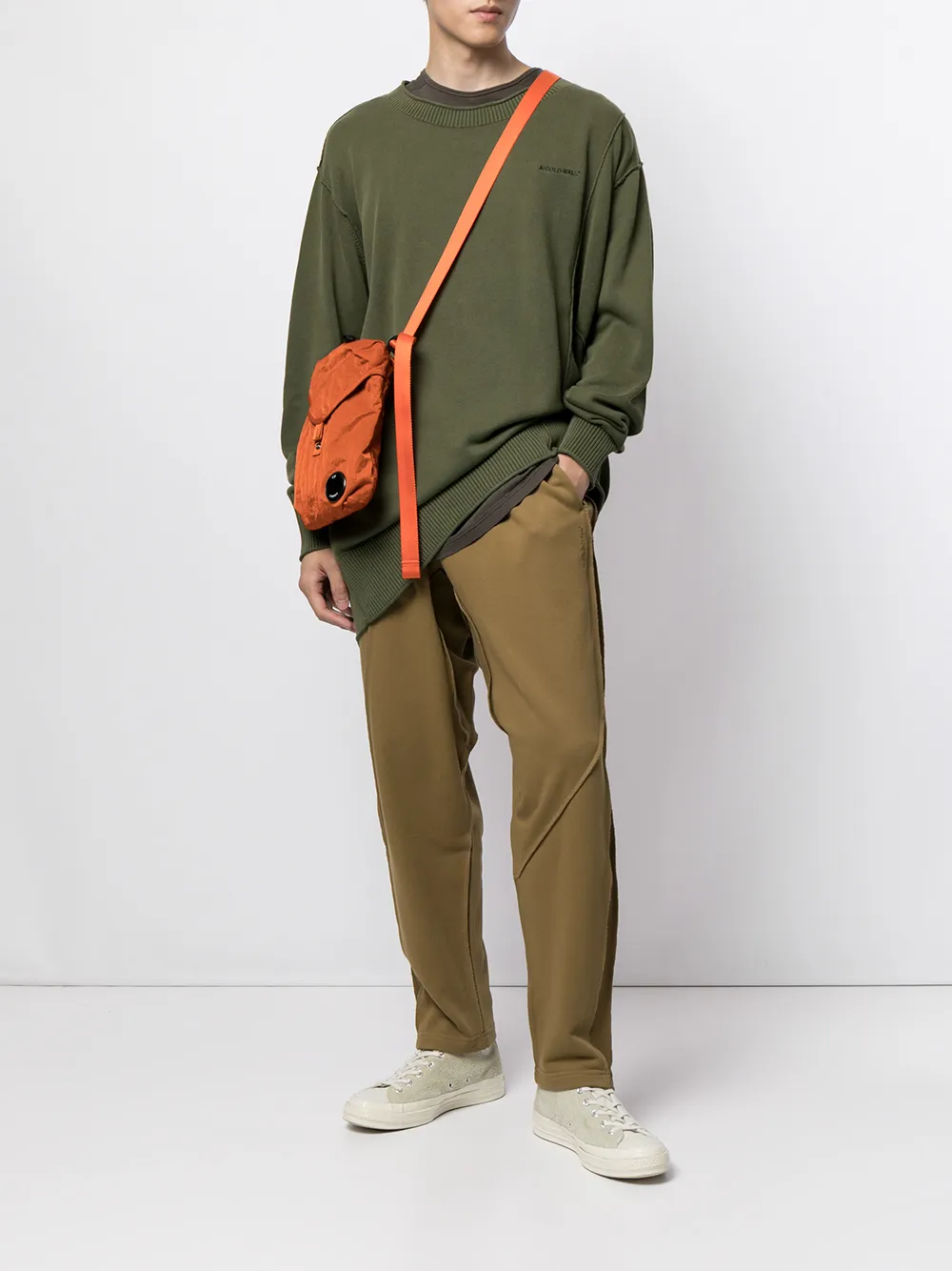 Необработанные края, декоративные швы, вышитый логотип, эластичный пояс и прямой крой.