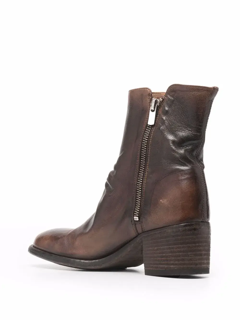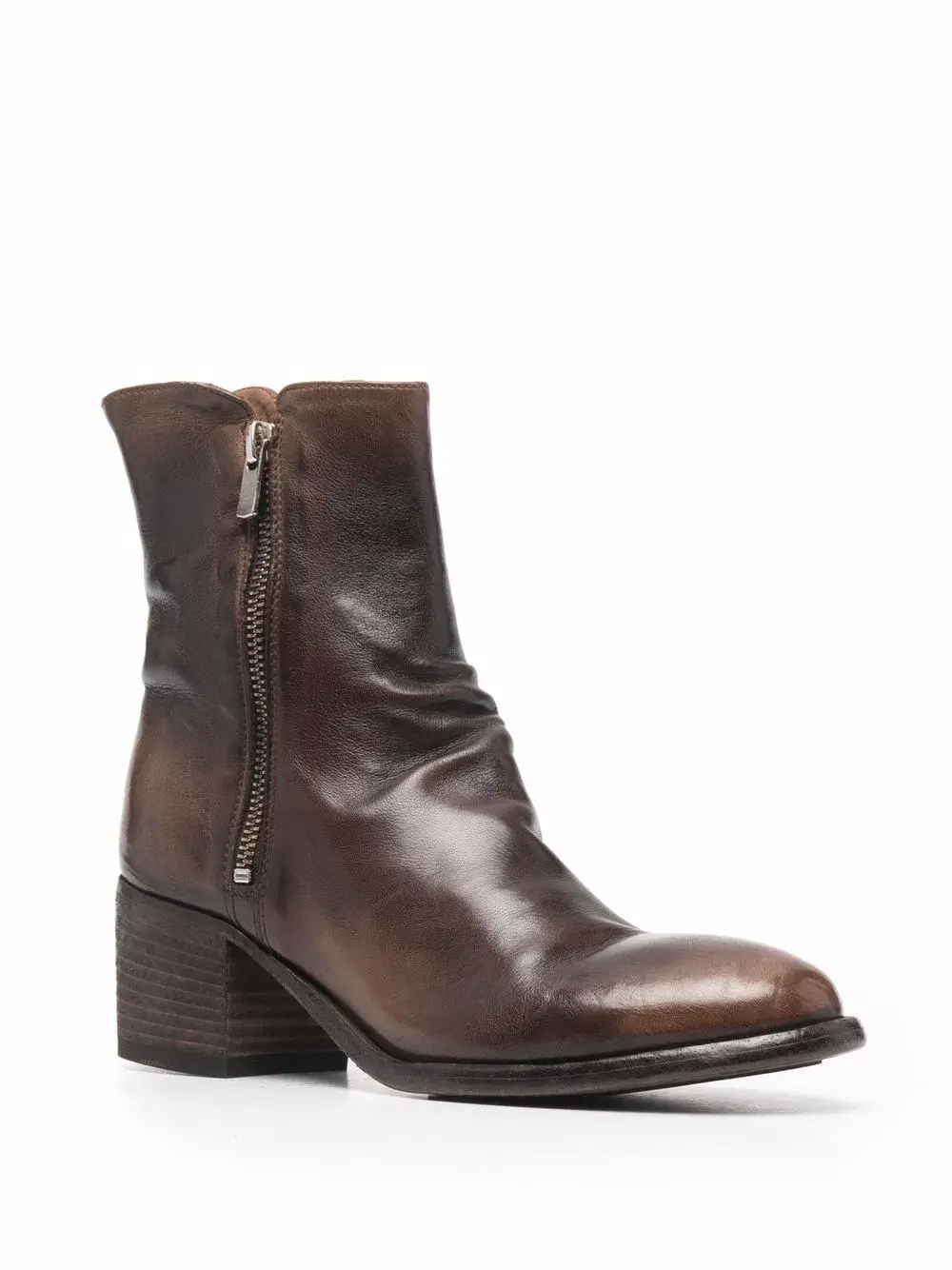 Глянцевое покрытие, миндалевидный носок, длина по щиколотку, застежка на молнии сбоку и низкий блочный каблук.