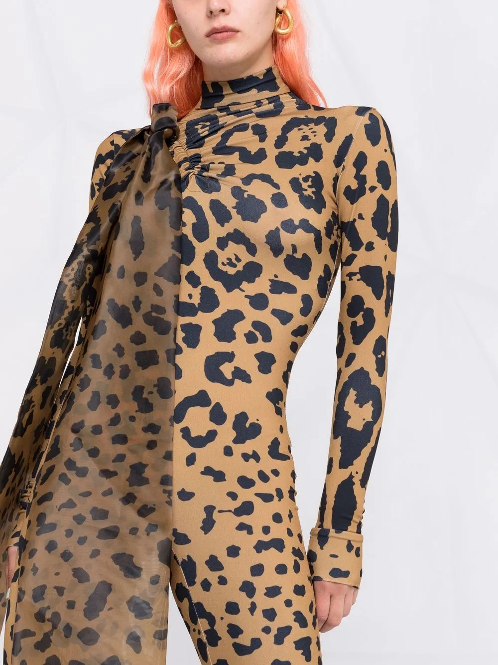 Дизайн со сборками, драпировка, сплошной леопардовый принт, высокий воротник, длинные рукава, потайная застежка на молнии сзади и эластичная модель.