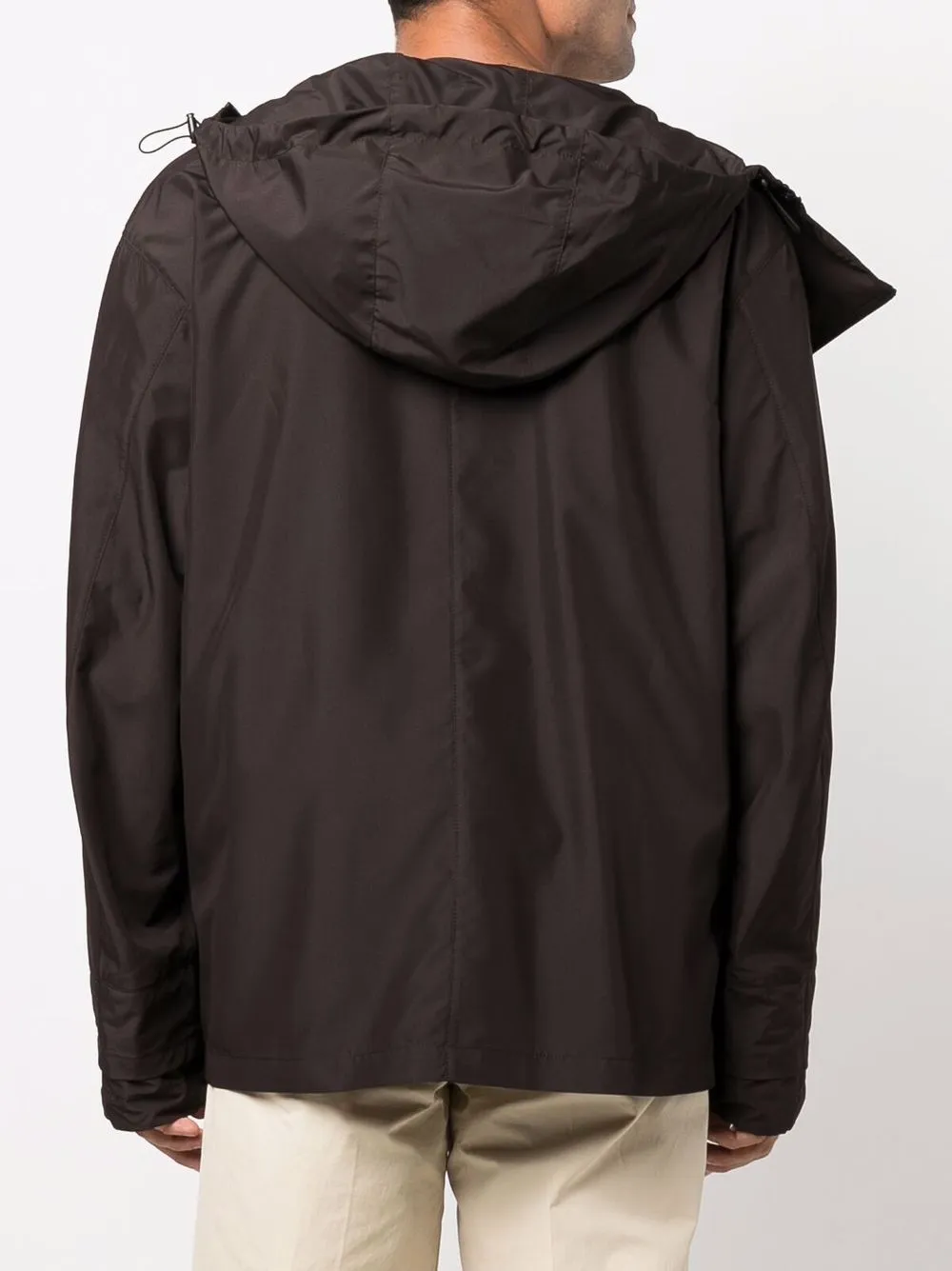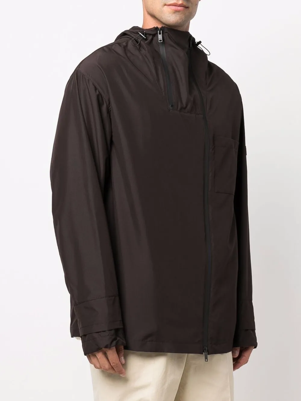 Классический капюшон, смещенная застежка на молнии спереди, нагрудный накладной карман и длинные рукава.