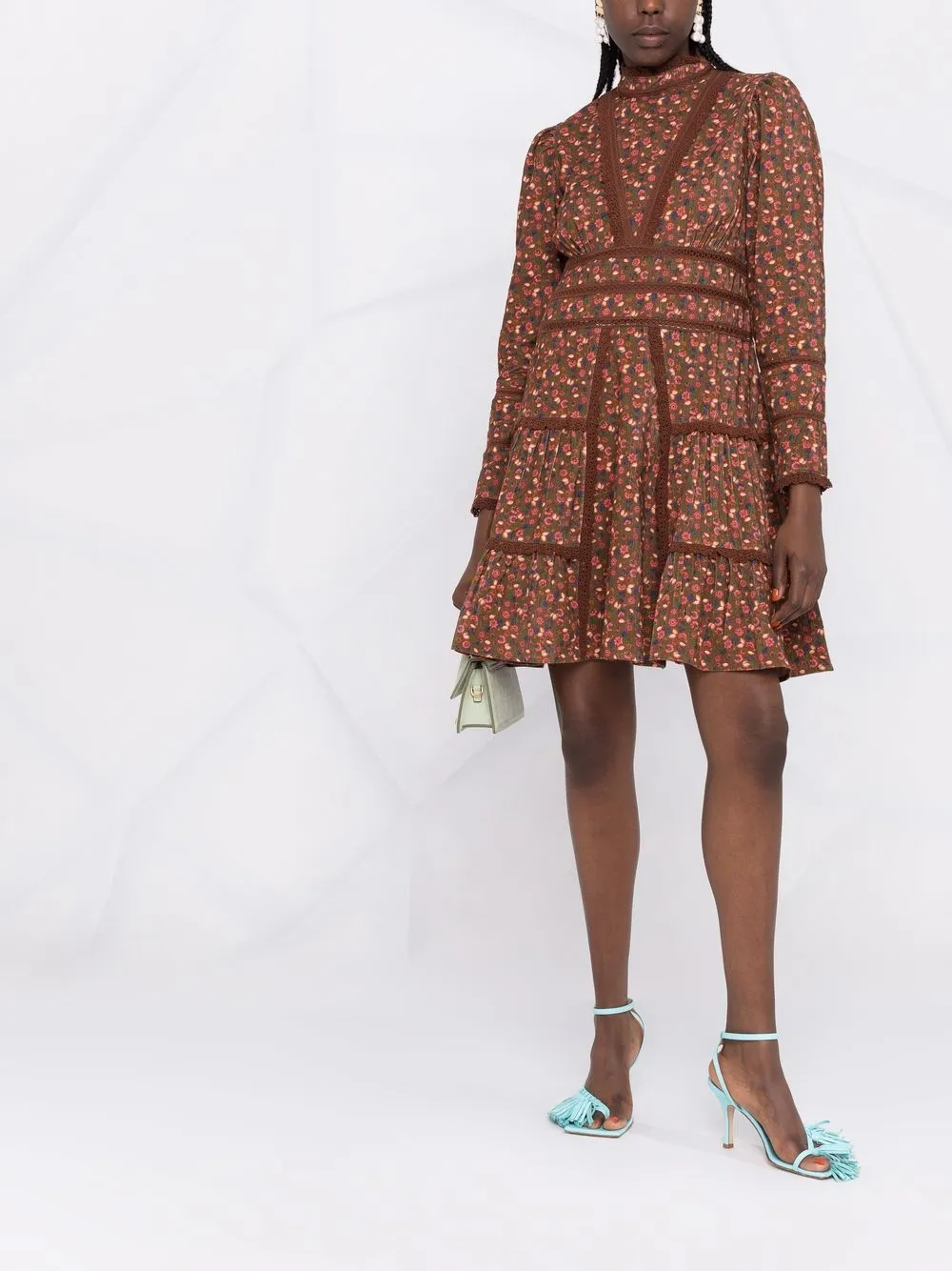 Коричневый, хлопок, сплошной цветочный принт, высокий воротник, длинные рукава, потайная застежка на молнии сзади и ярусная юбка.