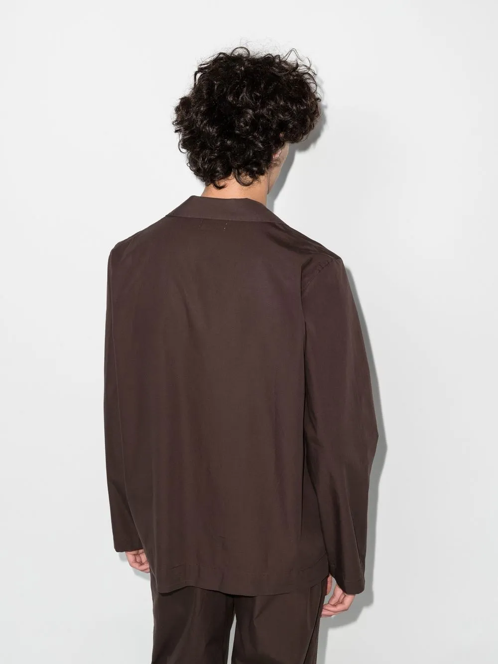 Темно-коричневый, органический хлопок, отложный воротник, нагрудный накладной карман, длинные рукава и застежка на пуговицах спереди. .