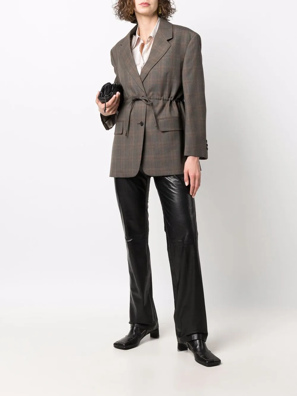 Клетчатый узор, зазубренные лацканы, подплечники, длинные рукава, пояс на шнурке, два передних кармана с клапанами и застежка на пуговицах спереди. Цвет: коричневый.