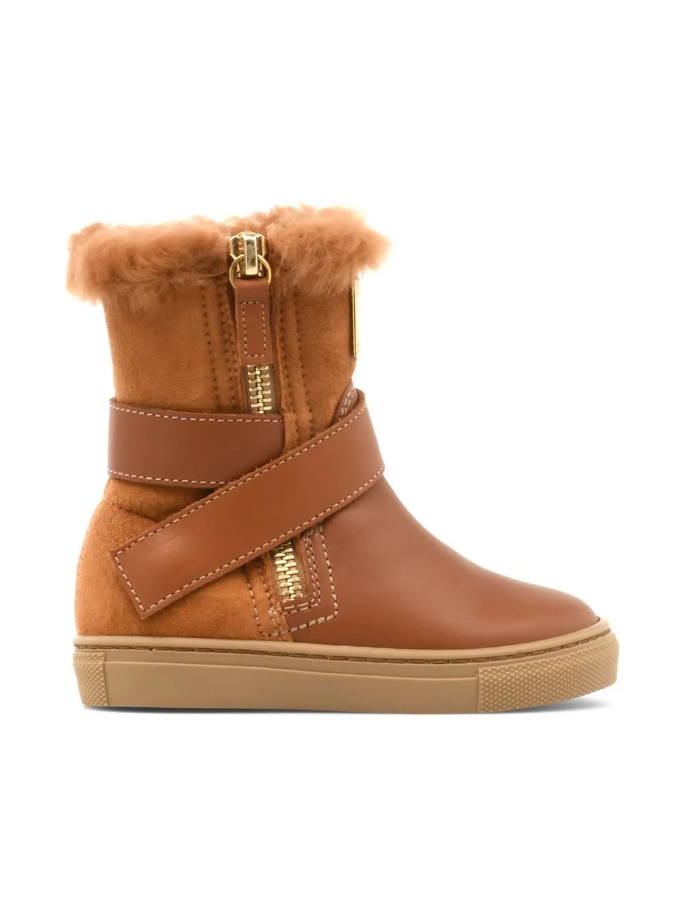 Вставки, золотистый металлический логотип, закругленный носок, застежка на молнии сбоку, длина до середины икры, отделка из искусственного меха и плоская резиновая подошва. Цвет: коричневый.