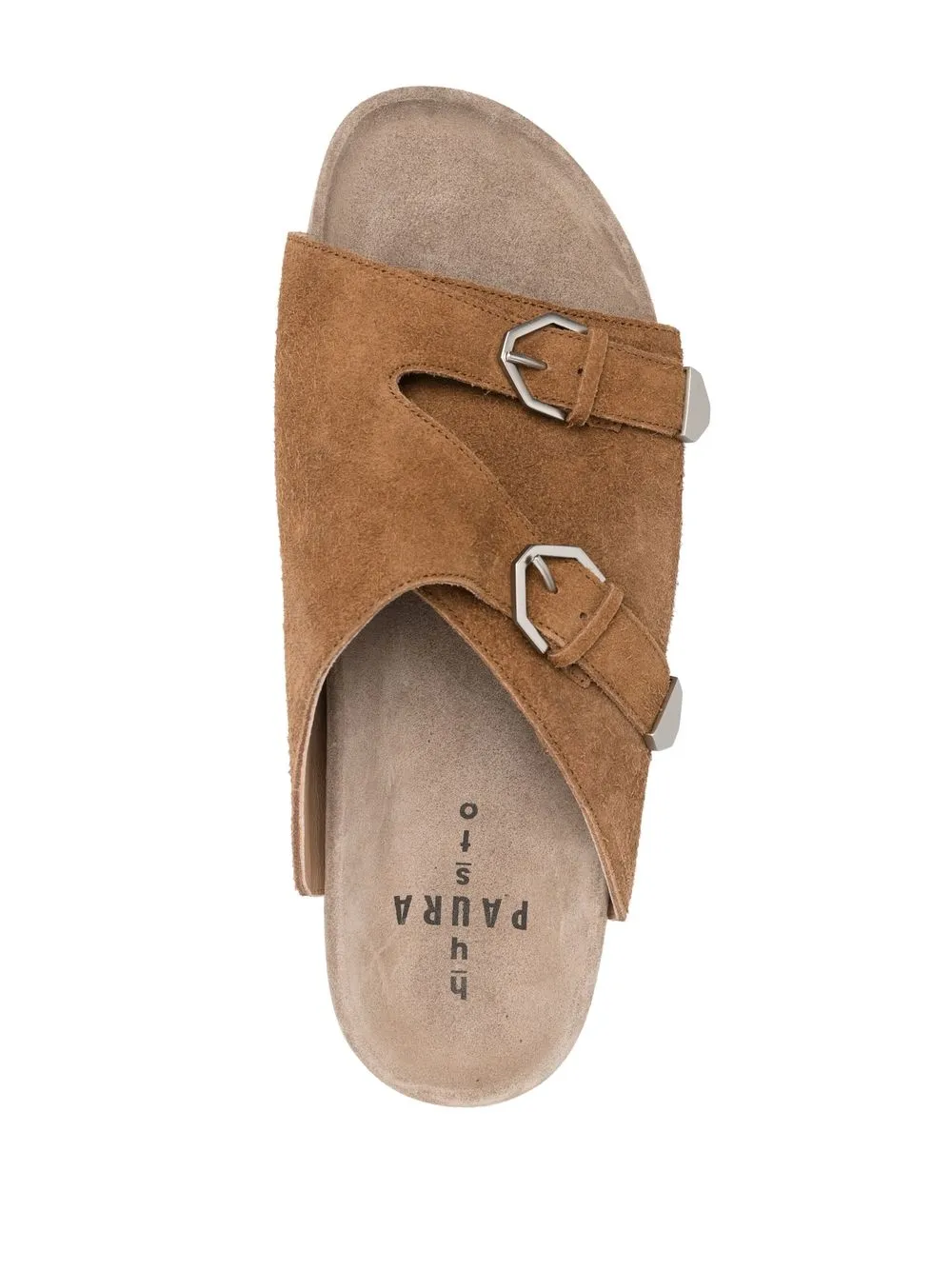 Застежка с пряжкой спереди, открытый носок, модель без застежки, стелька с логотипом и плоская резиновая подошва.